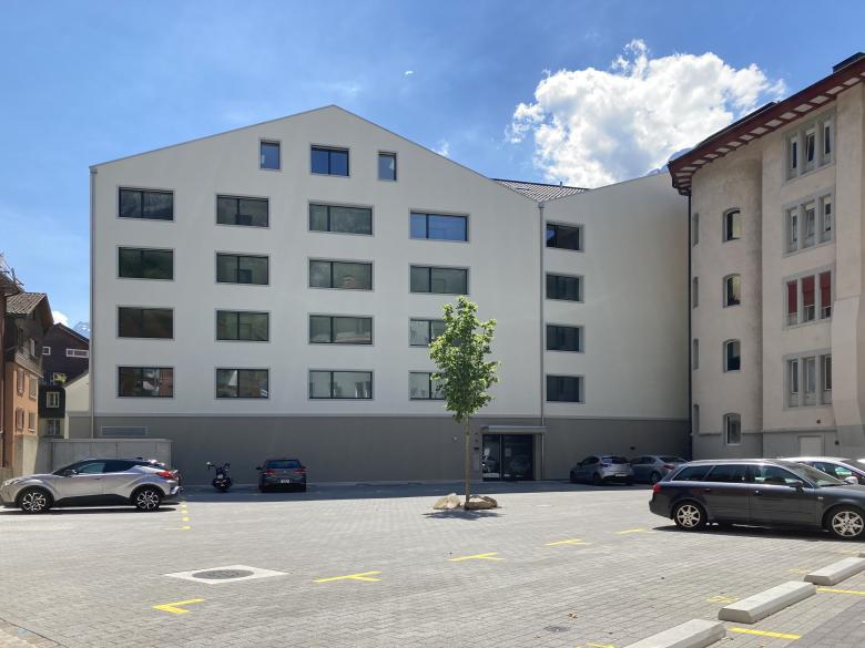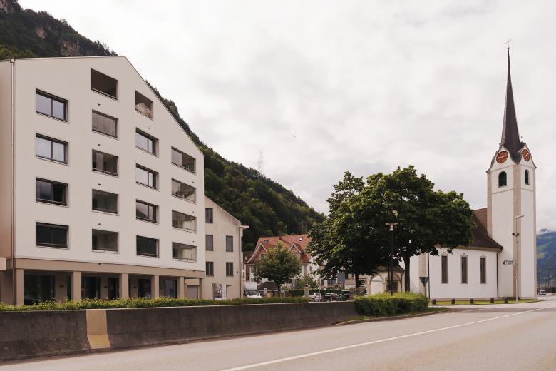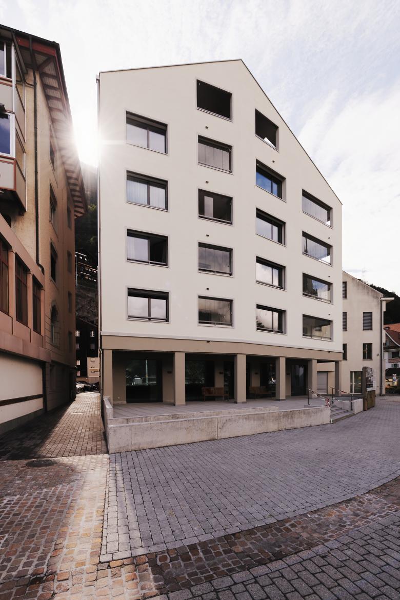 Die im Zentrum von Flüelen liegende Liegenschaft «Weisses Kreuz» deckt das Bedürfnis für altersgerechte Wohnungen an zentraler Lage in allen Belangen ab. Die schiefwinklige Form des Volumens passt sich in die bestehende Struktur des dicht bebauten Dorfkerns ein und fügt sich durch seine Setzung wie selbstverständlich in das im ISOS eingetragene schützenswerte Ortsbild.