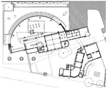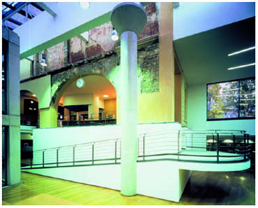 Die neuen Anbauten verstehen sich als moderne Fortführung des vorgefundenen Collagenprinzips. Die teils ruinös gelassenen Materialien aus den unterschiedlichen Entstehungszeiten der Altbauten wurden ergänzt durch großflächig angelegte, selbstbewusste Elemente des Neubaus.