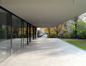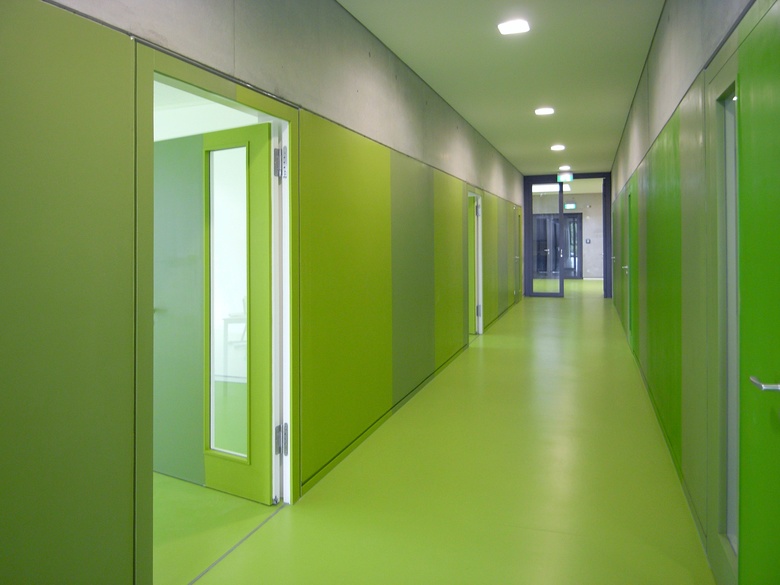Im Erdgeschoss des Erweiterungsbaus befinden sich im Süden ein Foyer, sowie an der Gartenseite der Speiseraum für ca. 60 Schüler. Dieser Speiseraum öffnet sich entlang der Längsseite über eine vorgelagerte, überdachte Terrasse zum Garten hin. Auf der Nordseite wurde die Küche mit ihrer Anlieferung und den Personalräumen vorgesehen. Über eine großzügige Treppe erreicht man das Obergeschoss welches ebenfalls, wie das Erdgeschoss, stufenlos an den Bestand anbindet. Hier befinden sich die Klassenräume auskragend über die Terrasse. Diese Auskragung ist aufregend und schützend zugleich - sie verwebt Innen mit Außen. Der Erweiterungsbau versucht zwischen Bestand und eigener Haltung zu vermitteln. Er führt einerseits die Höhen- und Fassadengliederung fort und besitzt andererseits ein gänzlich anderes Raumverständnis.