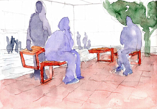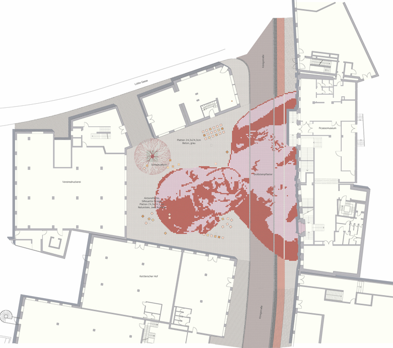 Als imaginärer Schatten wird die Silhouette des Künstlers Pablo Picasso durch zwei unterschiedliche Naturwerksteinflächen gebildet. Das Pflasterbild klammert durch eine Überlagerung zweier Flächen nicht nur den Raum zusammen, es sucht auch eine historische Dimension neu zu definieren. Nach den Stimmen der Bürgerbeteiligung soll der Platz für Jedermann kostenfrei sein; die damit einhergehende abwechselnde Nutzung wird durch flexible Sitzgelegenheiten widergespiegelt.