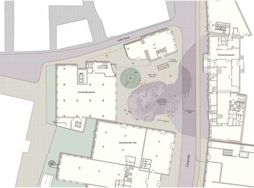 In Ergänzung zum beschlossenen „Lichtkonzept Münster“, gültig für den gesamten Altstadtbereich, soll die Fassade des Picassomuseums, wie auch andere wichtige Altstadtbauten, eine dezente Fassadenanleuchtung erhalten. Diese Anstrahlung rückt die Fassade des Museums an die wichtigste Stelle und fokussiert damit den Platz auf das Gebäude. Die weiteren Platzfassaden sollen ebenfalls aufgehellt werden, aber, um einen Hintergrund zu bilden, deutlich weniger.