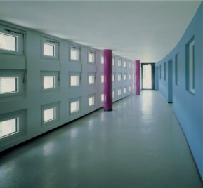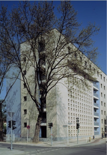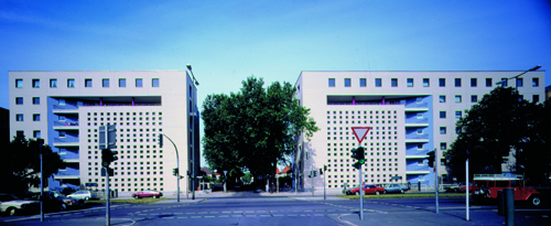 Als Reaktion auf den Straßenlärm sind die beiden neuen Gebäude aus zwei Körpern zusammengesetzt: Ein geschlossener Rigel mit Laubengängen und Nebenräumen bildet einen Puffer zur Straße. Aus diesem schiebt sich ein bogenförmiges Bauteil, dessen Wohnbereiche überwiegend zum ruhigeren Blockinnenraum orientiert sind. Die konsequente Symmetrie und stark skulpturale Wirkung machen die Anlage zum neuen Tor der historischen "Fliegersiedlung".