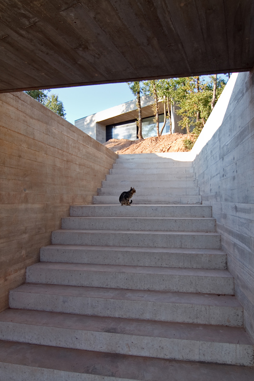House constructed materials, concrete and iron, dialogue with the environment; they are natural, without artificial substances and they change over the time like the place. The concrete formwork with wooden slats symbolized the forest footprint on the house.