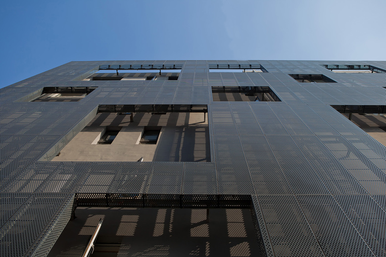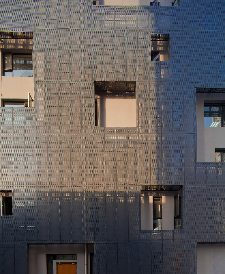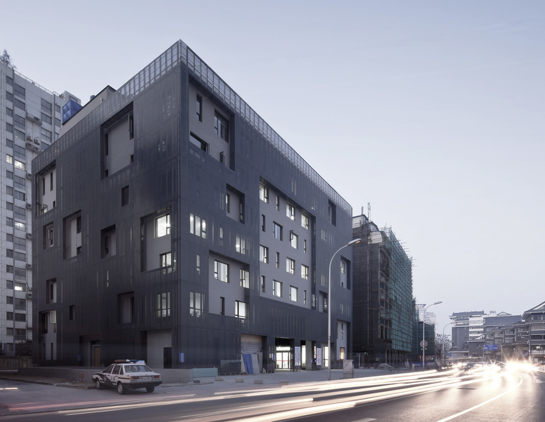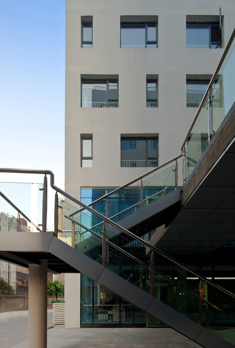 The office building area applied a 5.6 x 5.6 m column axis, fully considering the economics of underground garage parking. The office area makes use of an open plan form. The area is divided into 1.4 m standard office modules which allow the basic requirements to be flexibly integrated into the area. The facade design centres on an "Open-Window" concept forming rich layers, composed with a graphic modelling system. This comprises a double layer systema with the transparent light-gray perforated metal and the isolation glass. A balcony, greenery and the outside air-conditioning unit are installed in the inter-layering ofthe outer skin and the inner wall. The facade facing to the inner garden uses the screenprinting glass with the bamboo motivtion, the light sun-shutter window blinder in-between.