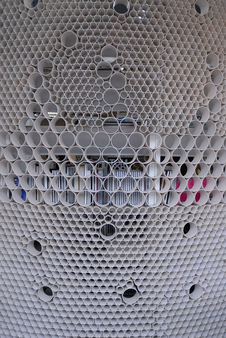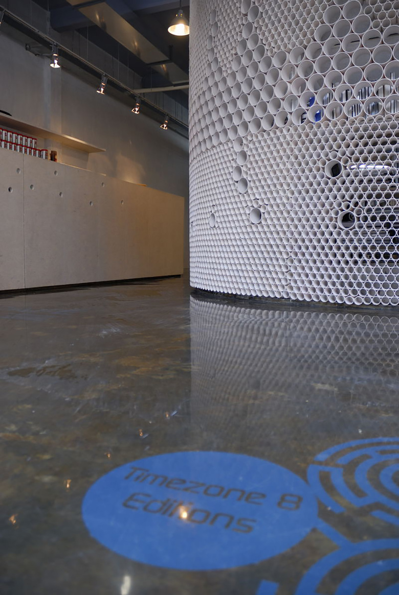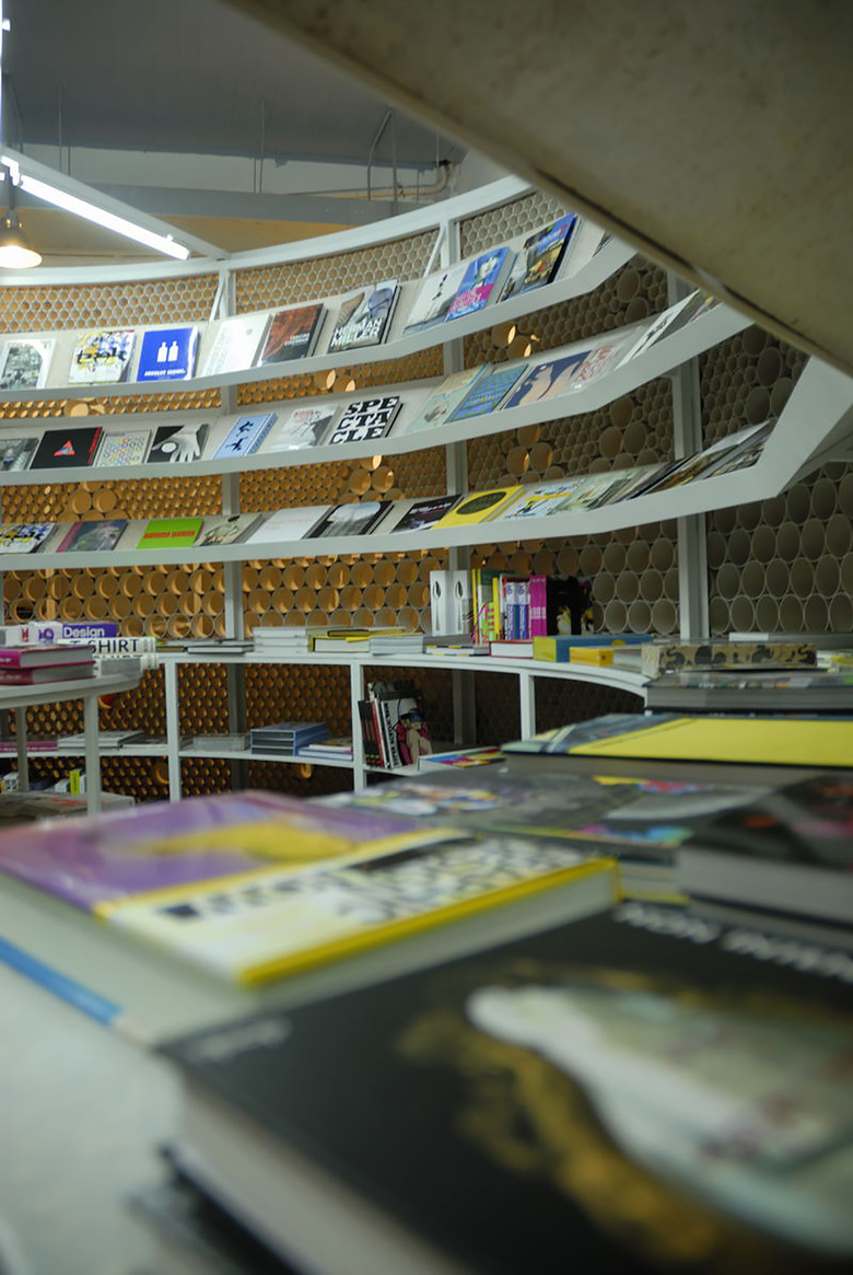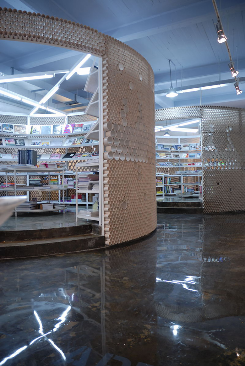 Each book silo contains its own theme: photography, art and design. All of the silos are the same height but are differentiated by their diameters. The first aim was to create transparency within the space. This was achieved by constructi at eye level and 50mm below and above, it is possible to manipulate the experience of transparency. Altogether, approximately 20,000 cross sections of PVC pipe are used. Secondly, by constructing only a general regulation for the building of the structure, the final construction was left to the artisan. The design regulations encouraged experimentation throughout the construction process in order to find the best solution. Therefore, the finished design is also a work in progress, just as in the traditional Chinese construction process where there is an element of trial-and-error.