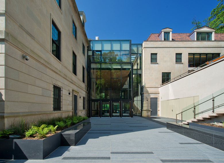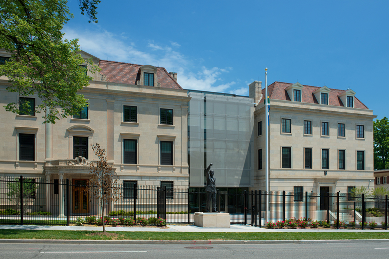 The modernization of the embassy complex involves the adaptive reuse of an existing residential building to provide for additional chancery functions, the replacement of existing building systems, and the improvement of life safety measures. An infill addition between the residential building and the existing Chancery provides a new main entry, two story lobby atrium and a monumental stair to improve visitor circulation and security. Guiding our work were the goals to consolidate embassy staff into one central complex; to create a central point of entry to improve visitor circulation and security; and to create a contemporary design expression to symbolize a “New South Africa.” The newly renovated and expanded facilities increases the overall size of the buildings by approximately 4,200 square feet.
