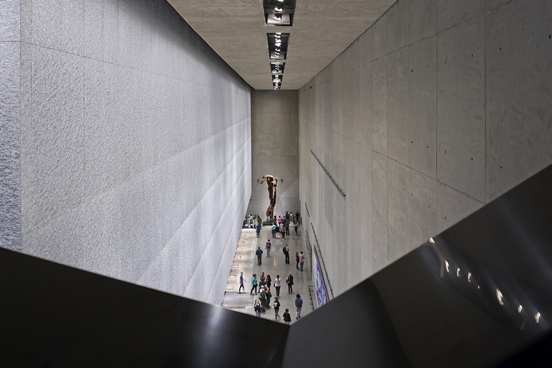 Entering through a pavilion on the Memorial Plaza, visitors descend onto the Concourse Lobby, a place of orientation and the beginning of a gently sloped path, referred to as “the Ribbon,” that runs to bedrock. At key points, overlooks reveal artifacts and historic resources including abstractions of the tower volumes faced in aluminum floating above the original column bases. One’s journey culminates alongside the “Survivors’ Stair” that led hundreds to safety on September 11th. Throughout the museum a palette of limited materials that is restrained in appearance enables visitors to have individual responses to the artifacts and exhibit contents, such as the surviving slurry wall, the “Last Column,” and the box columns of the original World Trade Center.