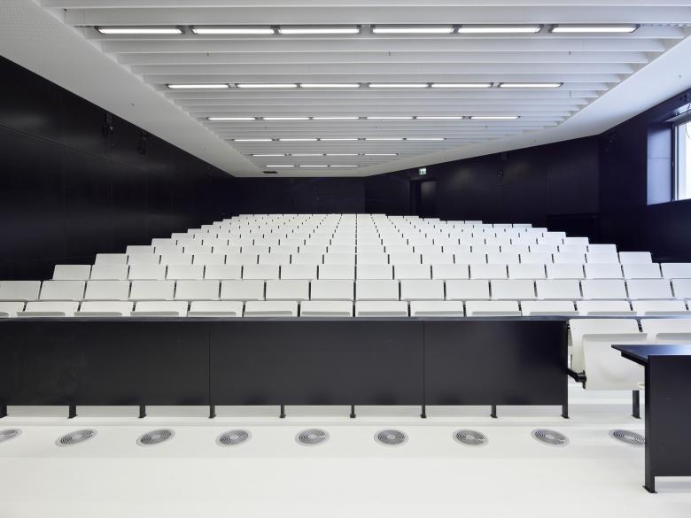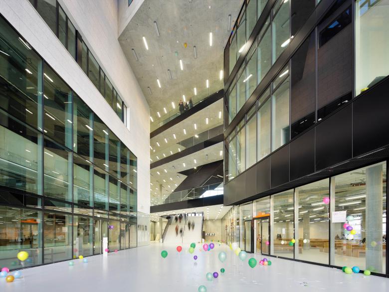 Der Neubau gliedert sich in zwei Teile, die durch eine transparente mehrgeschossige Halle vertikal und horizontal eng vernetzt sind. Der Ansatz des interdisziplinären Arbeitens der Universität spiegelt sich in der Entwurfskonzeption durch eine Funktionsmischung im Gebäude wider.