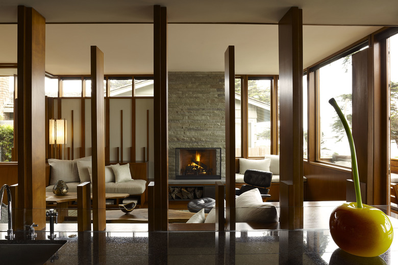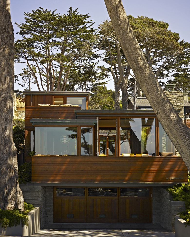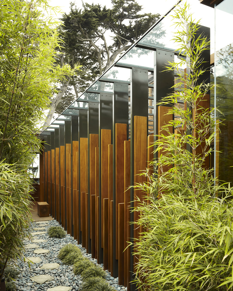 The house sits on a dense site facing Carmel Bay and the Pacific Ocean. The clients were keen to be fully cognizant of this amazing setting in all areas of the home. As such the house was conceived as a central room comprised of the courtyard, living room, and bedroom, bordered by niche spaces for the kitchen, breakfast nook, office and master bath. Fully folding doors/walls adjacent to the courtyard from the living room and bedroom literally open the full space up, and the rhythmic edge of vertical screen elements (solid mahogany and steel) create a loose border that stretches and compresses along its lengths.