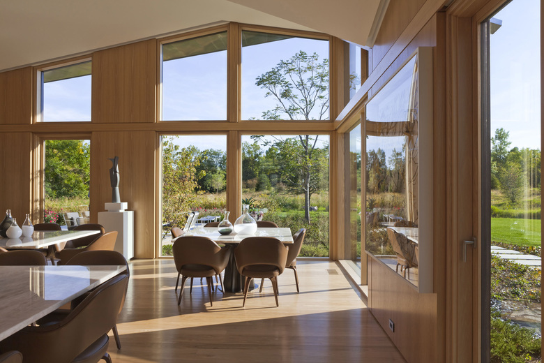Located on a rolling and expansive site in Northern Illinois, the residence is designed as a collection of single storey pavilions systematically distributed into the landscape. When entering the site, a low wall clad in stone emerges from the landscape as an introduction to the architecture of the main building. The programmatic pavilions are collected under an undulating roof plane, visually connecting the activity of the natural landscape to the dynamic composition of the new residence.