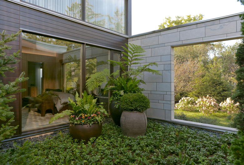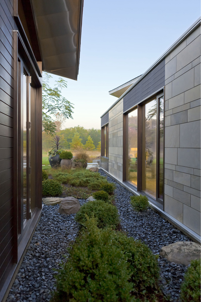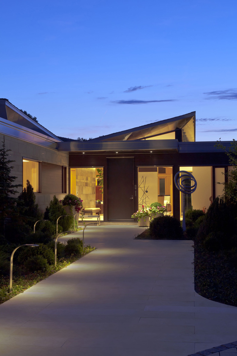 The main entry is located between the Bedroom Suite to the north and the Living & Dining Room volumes to the south. The Entry and Service Hall interiors are designed with consistent ceiling planes at a modest height. Upon entering the Living Room, Dining Room & Master Bedroom Suite the ceiling heights expand into an elegant faceted surface, opening expansive views of the surrounding prairie landscape.