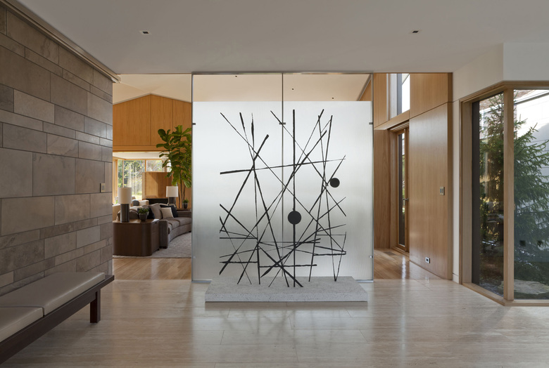 The exterior material palette is composed of a simple combination of stone, wood and glass intended to complement the trees, flowers and grasses typical of the local prairie landscape. The interior finishes (hickory, plaster, and a variety of stones) were selected for their subtle colors and textures, allowing the undulating ceiling plane to stand out as the residence’s predominant architectural feature.