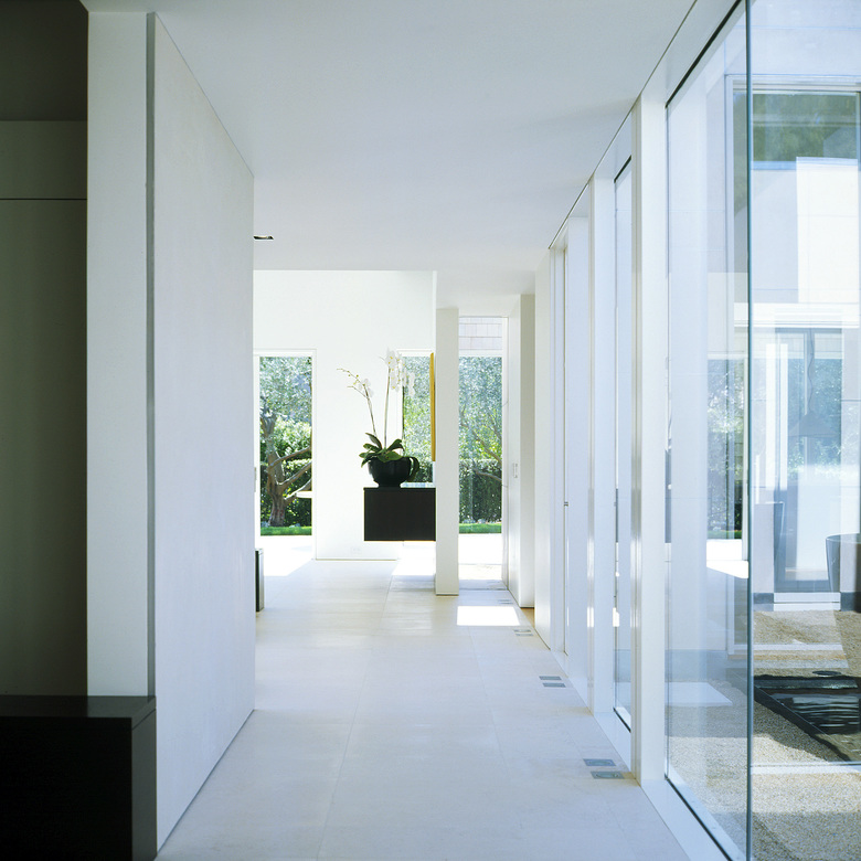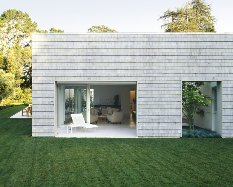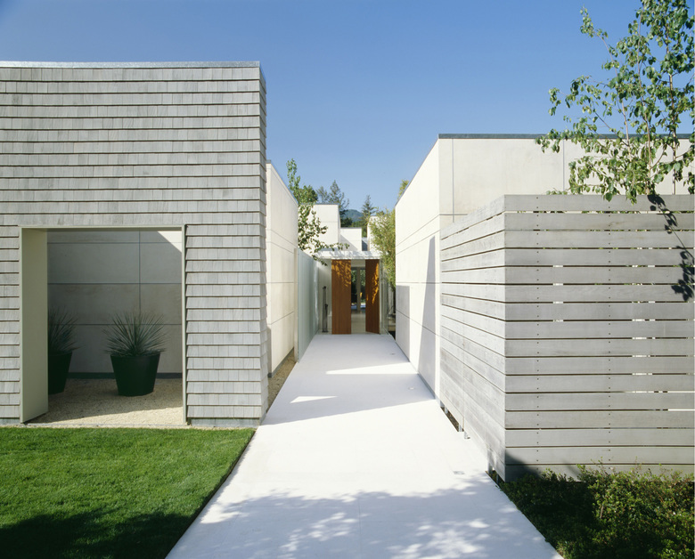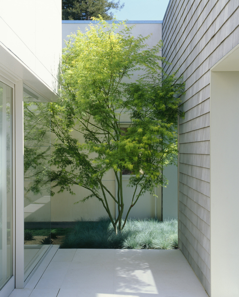 Accessibility, program, climate: all were important factors for a family of four who required a single story home and guesthouse on a one-and-a-half-acre site in Northern California. A stand of mature redwoods sits on one side of the property and a mountain range is visible to the southwest, meaning the site does not have a primary external view. The architect’s response to these conditions was to capitalize on the potential for a internalized landscape while exploring the dichotomy between the simple and the complex.