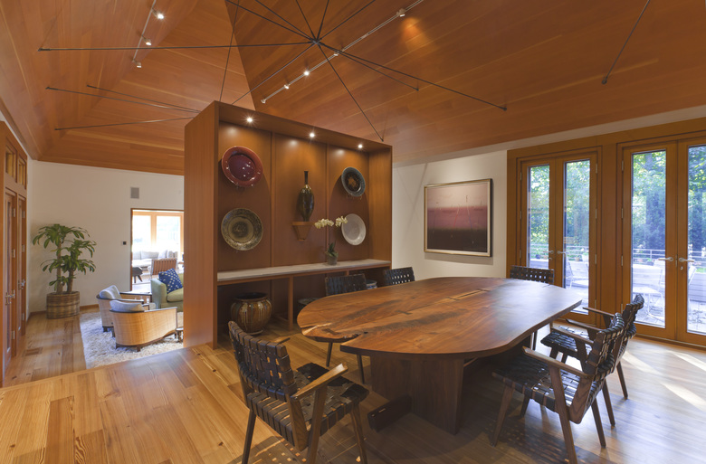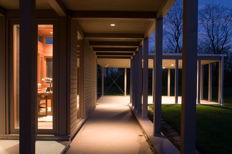 At the back of the house, a new structure extends beyond the main volumes of the house into the courtyard and surrounding landscape. Open in varying degrees to the outdoors, this structure provides alternate possibilities for circulation and encourages the use of both indoor and outdoor spaces.