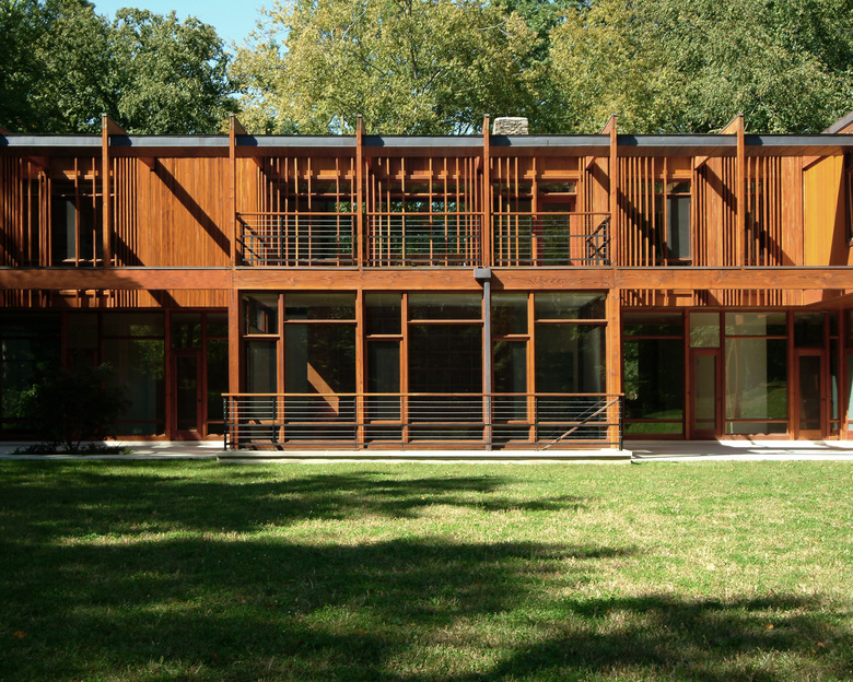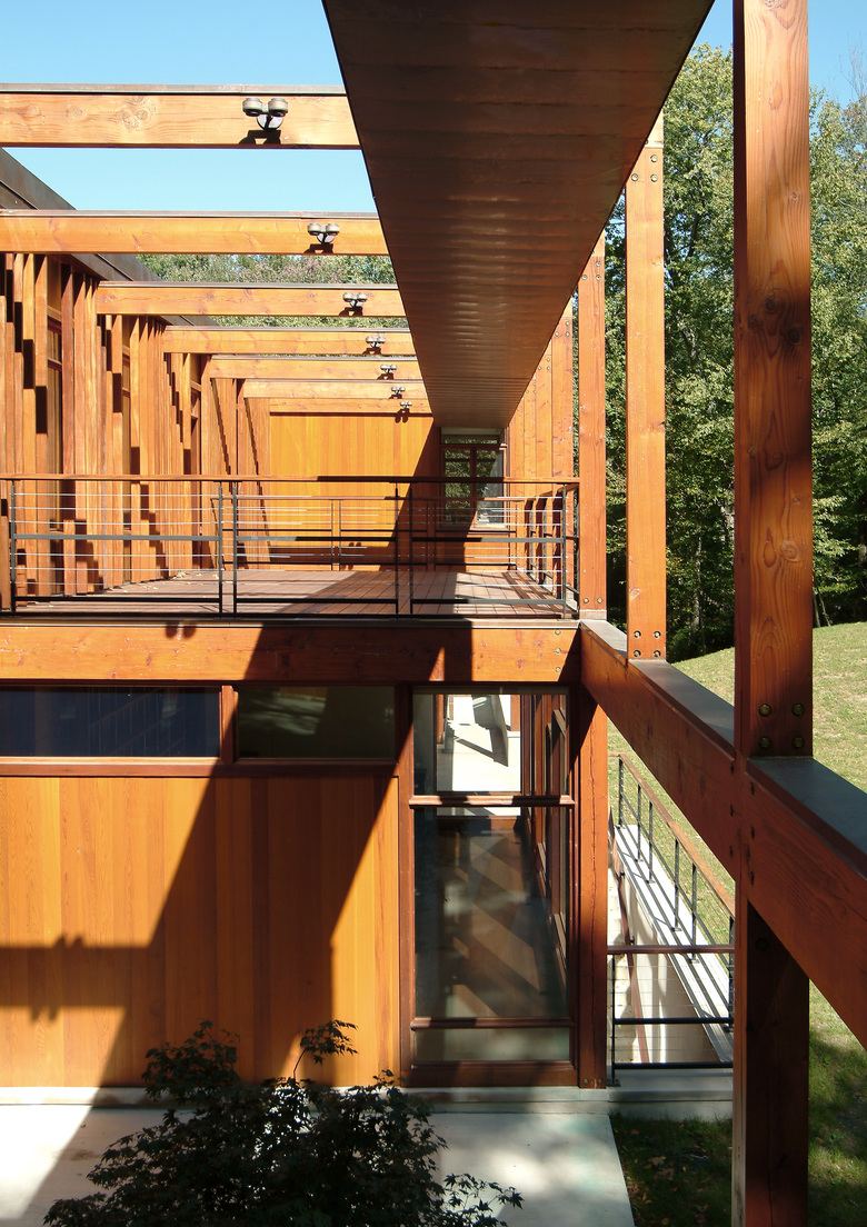 A fundamental design directive was to have the house meld comfortably into its natural setting by selecting materials consistent with the vocabulary of the forest. On the lake/west side, the wood screen configuration on the second floor is arranged in response to interior spaces that require varying degrees of transparency, resulting in a polyrhythmic series. This is set against the more primary punched openings in the ground floor stone wall, which clearly denote the presence or absence of mass. On the forest/east side, the timber frame structure is pulled out of the main volume, allowing the placement of more ancillary spaces to be tied both spatially and materially to the forest.