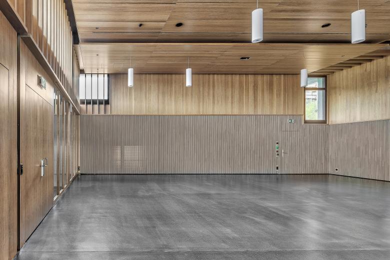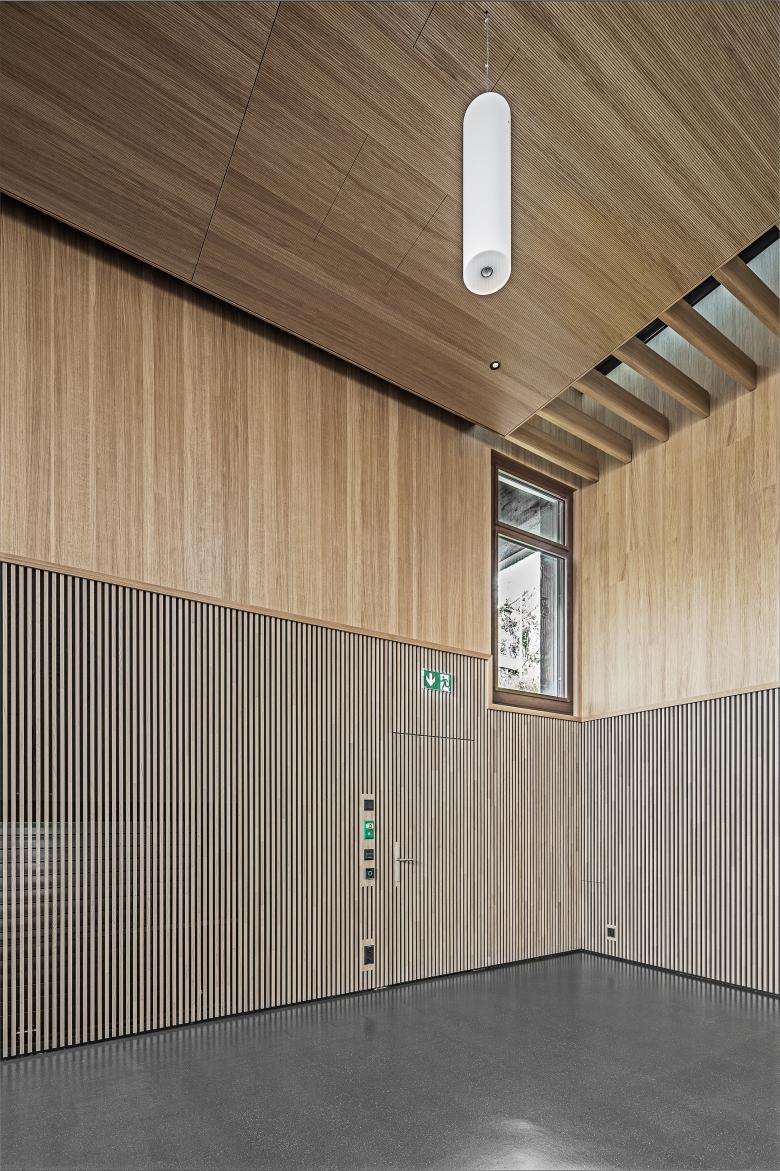 Der Campus der Interkantonalen Polizeischule Hitzkirch gehört zum Inventar der schützenswerten Ortsbilder der Schweiz. Im Aula Gebäude sollen neue Schulungsräume, Empfang, sowie Büroräume untergebracht werden. Aus Achtung vor dem grossen Ganzen erscheint es als richtig, den Charakter der Aula zu wahren. Die heutige Aula wird charakterisiert durch die Innenraumgestaltung mit Holz – dies wird so übernommen. Auch die Qualitäten der gestuften Decke und Wände werden beibehalten. Neu kann der grosse Saal einfach mit Schiebewänden in bis zu drei Seminarräume unterteilt werden. Der Empfang befindet sich künftig prominent am Anfang der Anlage.