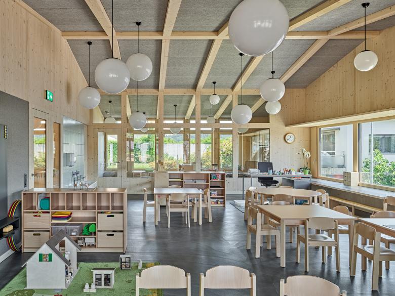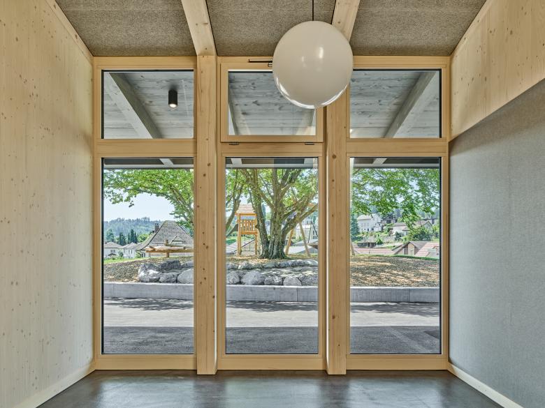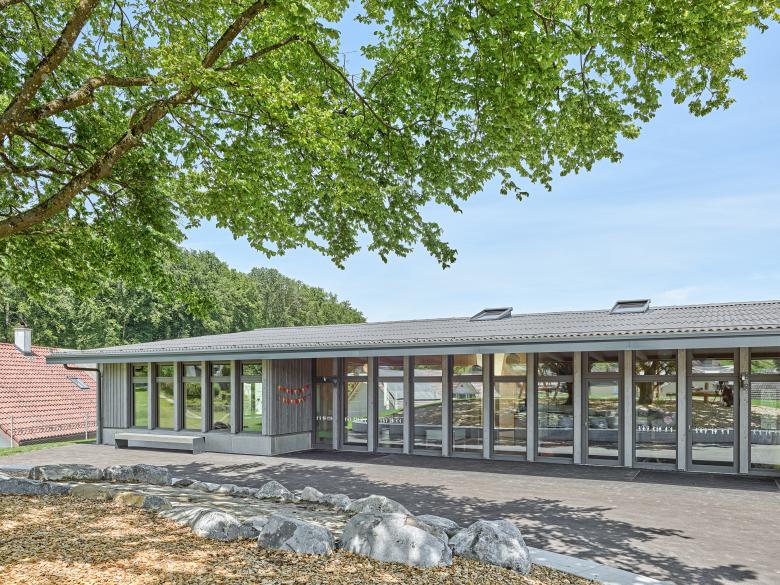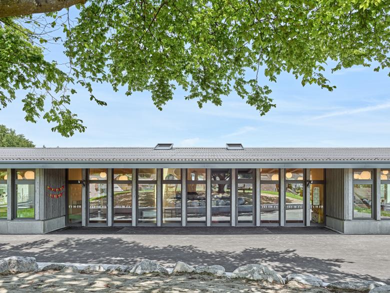 Der neue rechteckige Doppelkindergarten wird mit respektvollem Abstand zu den bestehenden Ulmen auf der Hügelkuppe am Nordrand der Parzelle positioniert. Durch den Rücksprung der Hauptfassade wird ein geschützter Aufenthaltsbereich im Aussenraum gebildet. Alle Nutzungen werden auf einem Geschoss mittels Raumschichten organisiert. Diese sind auf ei-nem Raster aufgebaut und können flexibel eingeteilt, möbliert und ausgestattet werden. In den mittleren, zurückversetzten Raumschichten sind die allgemeinen Räume und die Nebenräume untergebracht. Die Haupträume profitieren von einer dreiseitigen Belichtung.