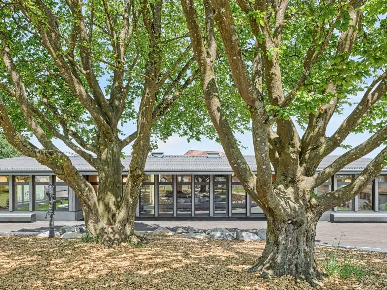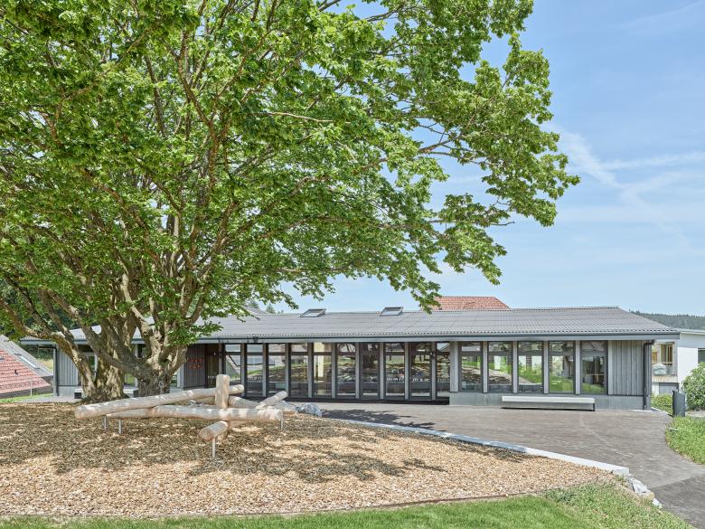 Die topographischen Verhältnisse, die Volumensetzung und die beiden Ulmen definieren die Aussenräume. Zwei ge-schwungene Wege führen auf den Vorplatz des Doppelkindergartens. Der Hauptzugang erfolgt über den Auto- und Veloab-stellplatz beim Flurweg über den Weg mit gleichmässiger Steigung von max. 6%. Dem Gebäude vorgelagert ist ein asphal-tierter Platz. Eine geschwungene Sitzstufe definiert den Abschluss des Platzes und dient als Sitzgelegenheit oder Aussen-schulzimmer. Unter dem Baumdach wird ein Kiesplatz mit Spielgeräten angeordnet. Die restliche Kuppel ist als Rasenflä-che und die steileren Hangbereiche als Blumenwiese ausgestaltet.