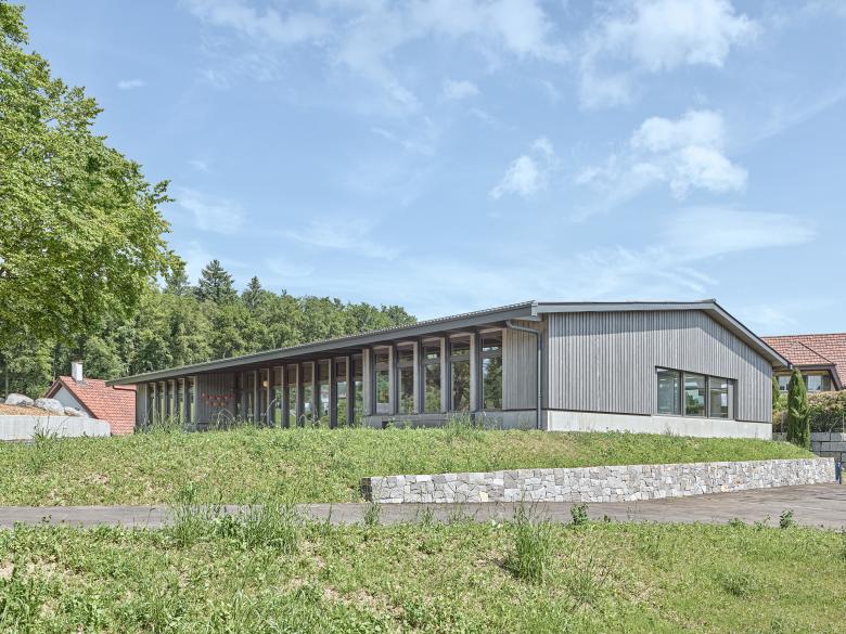 Die Bodenplatte wird in Stahlbeton ausgeführt. Rund um alle Fassaden des Gebäudes zieht sich ein Betonsockel, auf wel-chen ein Holzskelettbau gestellt wird. Die Innenwände werden in Leichtbauweise erstellt. Die Fassaden sind mit einer Holz-lattung aus Fichtenholz verkleidet. Das Dach ist mit Welleternit eingedeckt.