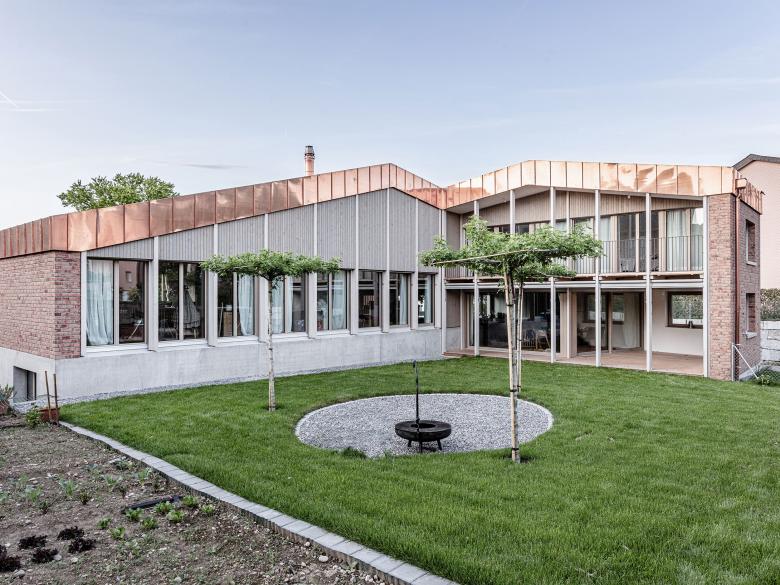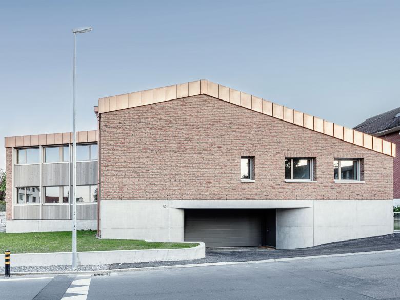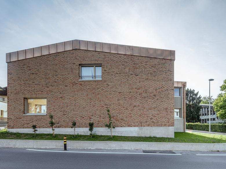 Gegenüber den beiden Strassen verhalten sich die Fassaden geschlossen. Zum Hof und Dorf hin prägt eine leichte Holzkonstruktion das Fassadenbild. Der dreiteilige Baukörper wird mit einem Betonsockel, einem Hauptkörper mit Klinkerfassade und Kupferdachrand gegliedert. Die beiden Baukörper sind halbgeschossig versetzt und nehmen den leichten Hangverlauf auf.