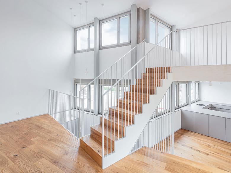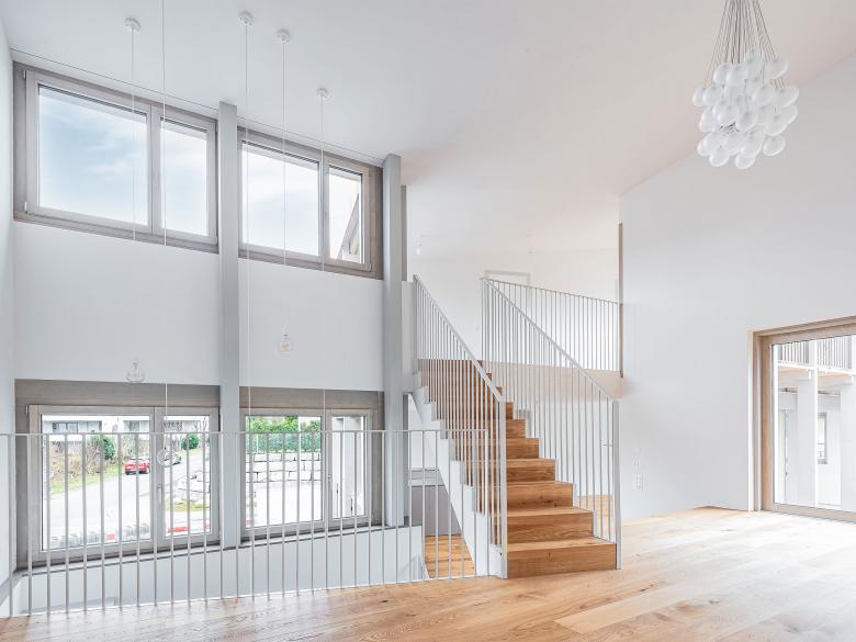 Der Baukörper orientiert sich an den umliegenden Gebäuden aus der Jahrhundertwende und richtet sich parallel zur anliegenden Strasse aus. Die zwei zusammengeschobenen Volumina spannen mit den Nachbarbauten einen vom Strassenlärm abgeschirmten, hofartigen Freiraum auf. Die Dachform, zwei ineinander verschnittene Satteldächer, reagiert auf den Sonnenverlauf.