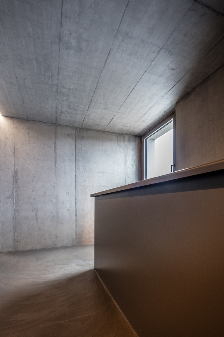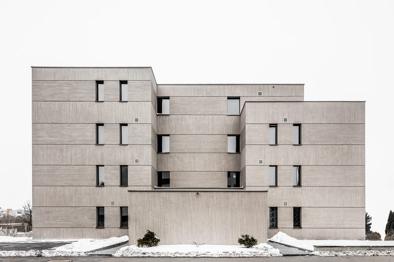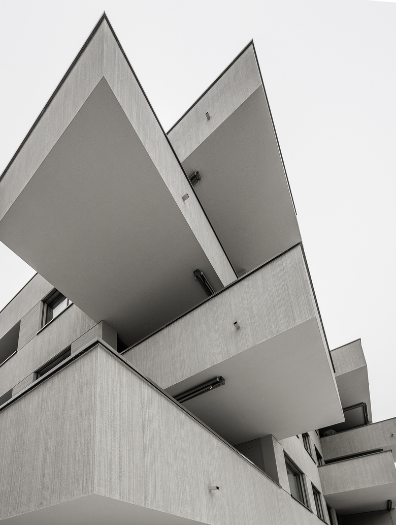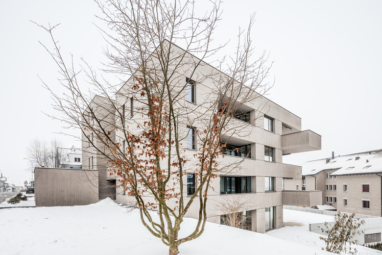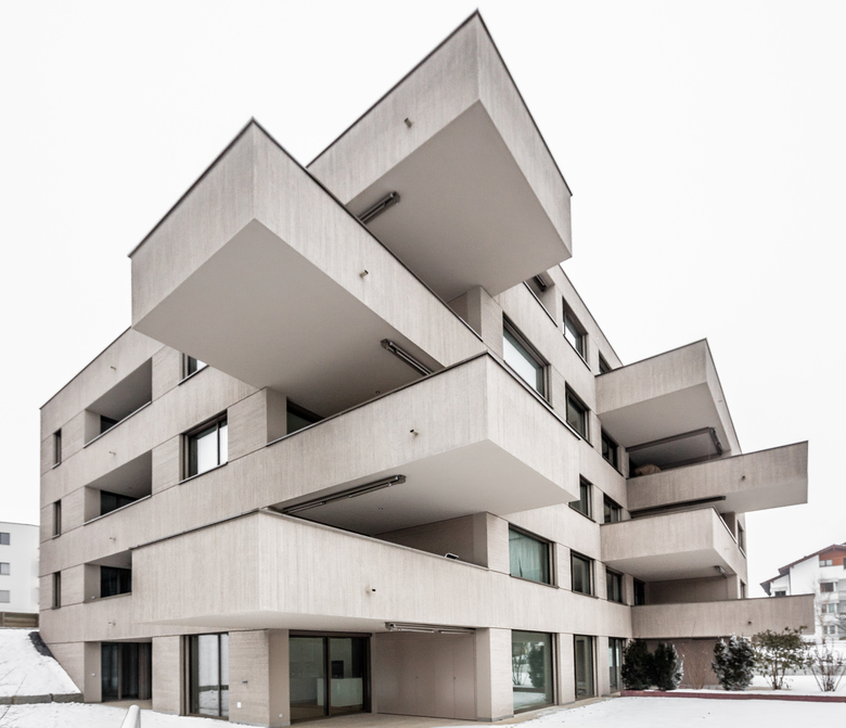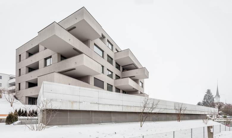 Die Feingliederigkeit der bestehenden Bauten wird in die Volumenbildung des Neubaus übernommen. Strassenseitig präsentiert sich der vertikal und horizontal versetzte Baukörper zurückhaltend. Diese volumetrische Haltung wird in der muralen Ausformulierung der Fassade fortgesetzt. So verleiht die alternierend wechselnde Verputzstruktur dem Wohnhaus einen zierlichen Charakter. Südseitig erscheint das Wohnhaus aufgelöst und in der Ausformulierung eigenständig. Die auskragenden Balkone sind geschossweise versetzt zueinander positioniert. Diese charakterisierende Gestaltung verhilft zu einer optimalen Besonnung der Wohnungen. Es entstehen abwechslungsreiche, gedeckte beziehungsweise offene, zweigeschossige Loggien. Der Aussenraum bildet sich durch die Terrassierung der Hangsituation. Es entstehen halböffentliche, sowie private natürliche Aussenräume für die Bewohner der Gartenwohnungen.