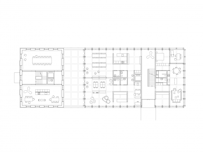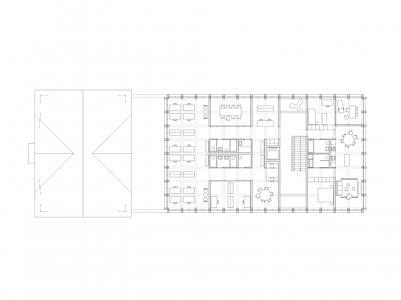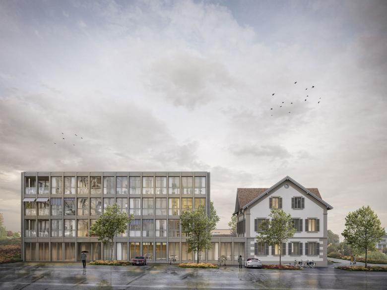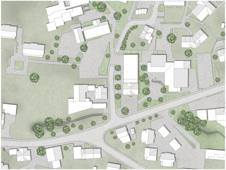 Das Gebiet um den Wettbewerbsperimeter zeichnet sich durch eine heterogene Siedlungsstruktur aus. Die Parzelle wird durch die Abtwilstrasse und die Ambar-Strasse gefasst. Eine wesentliche Projektidee ist der respektvolle Umgang mit dem spätklassizistischen Schulhausbau, welches volumetrisch freigespielt wird. Der prägende Charakter und die Eigenständigkeit dieses erhaltenswerten Gebäudes werden dadurch gestärkt. Der ursprüngliche Schulhausbau wird zurückgebaut und bleibt als Zeitzeuge erhalten. Das Gebäude wird zur Gemeindeverwaltung umgebaut und erhält mit dem zentralen Eingang vom neuen Dorfplatz her die ehemalige markante Adresse zurück. Ein rückwärtiger viergeschossiger Neubau wird mit einem respektvollen Abstand zum Bestand positioniert. Durch die Distanz profitieren beide Gebäude von einer guten Belichtung. Ein eingeschossiger Zwischenbau wird bündig mit den beiden Gebäuden verbunden. Es entsteht ein Ensemble mit einer spannenden Volumenabfolge. Die übrigen Nutzungen werden zur Ambar-Strasse im Neubauvolumen mit einem rückspringenden Eingang vorgesehen. Das Ensemble ordnet sich bezüglich Massstäblichkeit und Volumetrie überzeugend in den städtebaulichen Kontex ein und bildet somit den Auftakt des öffentlichen Gemeinde- und Schulareals.