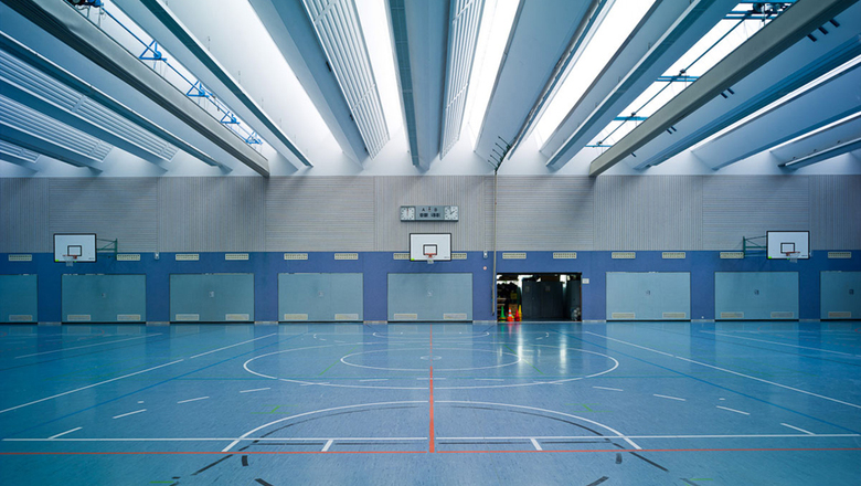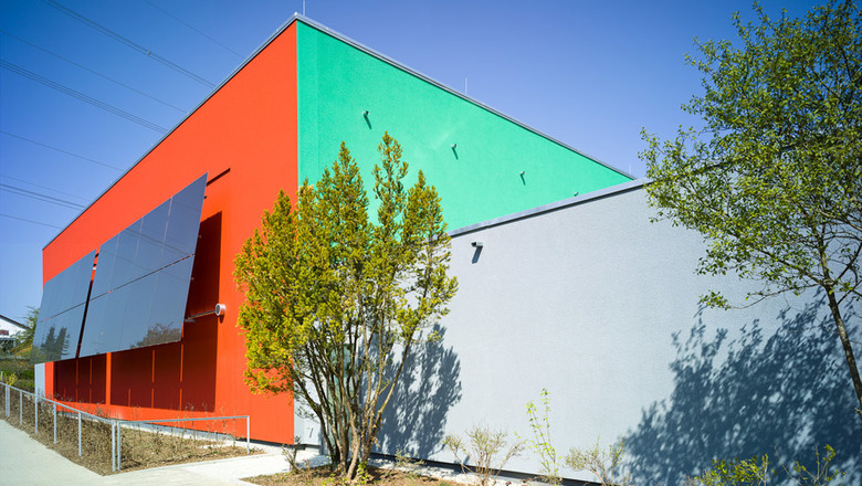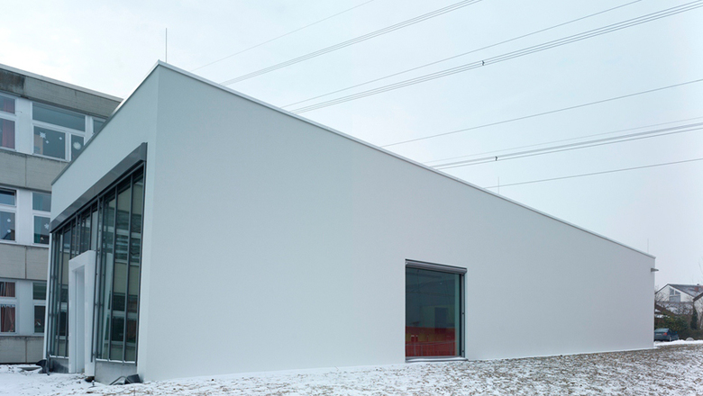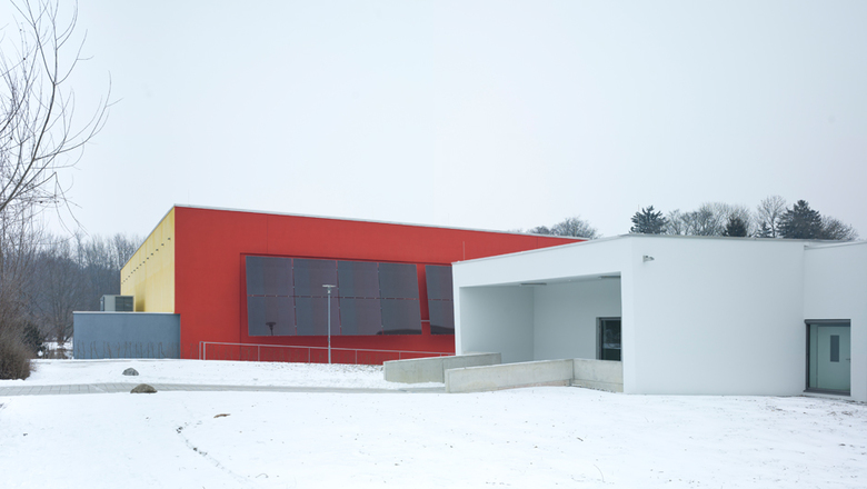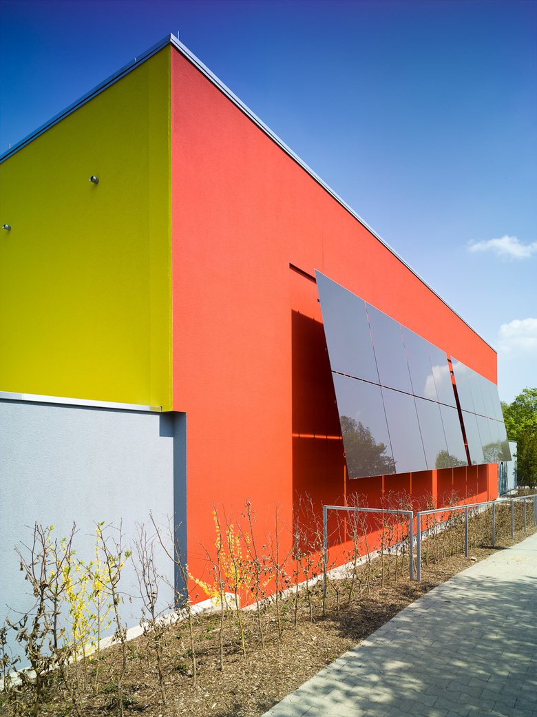 Die Sporthalle der Grundschule Weststadt wurde in den 1970er-Jahren als Stahlbetonskelettbau mit einer Bekleidung aus Betonfertigteilen errichtet. Das Gebäude wurde rundum neu eingekleidet, wobei aus Gründen der Nachhaltigkeit eine hinterlüftete Hartschalenbekleidung mit einer Putzauflage gewählt wurde. Dies wiederum ermöglichte die Ausführung eines Farbkonzeptes mit sehr kräftigen Farben des Le Corbusier Farbfächers. Jede Himmelsrichtung erhält eine eigene Farbe. In der später geplanten Sanierung des Schulgebäudes wird dieses Farbkonzept weiterentwickelt. Der Heizwärmebedarf ist drastisch gesunken, und die stark frequentierte und vormals triste Halle hat eine völlig neue Anmutung. Photovoltaische Silizium-Dünnschichtmodule geben der Halle eine futuristische Anmutung. Das Projekt wird mit der weiteren Sanierung der bestehenden Grundschule fortgesetzt, zwischen Grundschule und Sporthalle liegt die neu errichtete Mensa. Die Sanierung der Sporthalle erhielt für das Farbkonzept eine Anerkennung im Europäischen Farbdesign-Preis 2010-2011.