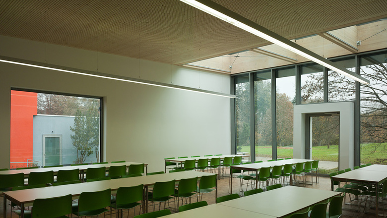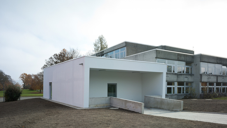 Die Mensa der Grundschule Weststadt ist ein erster Bauabschnitt zur Sanierung des Gebäudekomplexes aus den 1970er- Jahren. Nach einer von uns ausgearbeiteten städtebaulichen Analyse wurde der Standort unter Einbeziehung der großzügigen Freianlagen als Erweiterung des Schulgebäudes festgelegt. Die Stadt Ravensburg formulierte als Bekenntnis zum Klimaschutz die Anforderung,das Gebäude als zertifiziertes Passivhaus auszuführen, was wir entsprechend umsetzten. In der Mensa werden circa 130 Essen je Mittag ausgegeben. Die Farbgebung des Gebäudes mit der weißen Außenhülle ist Teil des von uns für den ganzen Schulkomplex ausgearbeiteten Farbkonzeptes. Im Sommer 2012 erhielt das Gebäude noch die wichtige Terrasse vor der östlichen Glasfront.