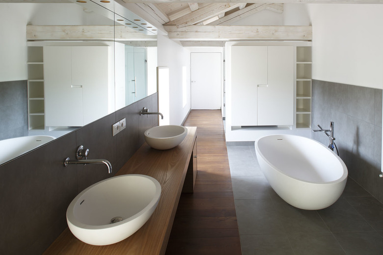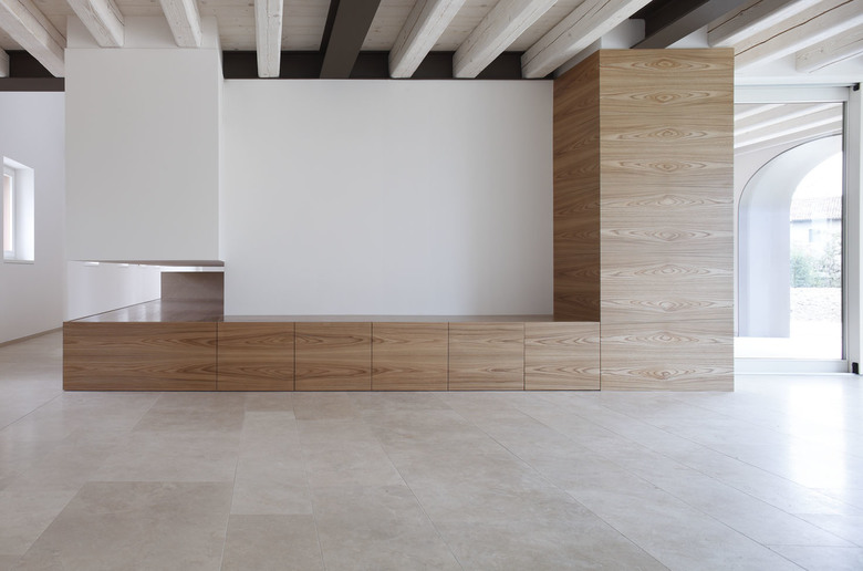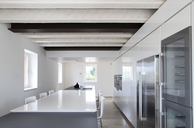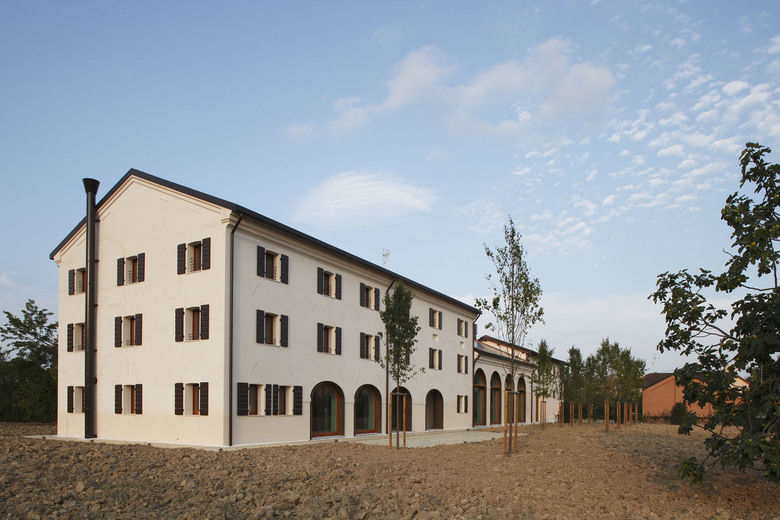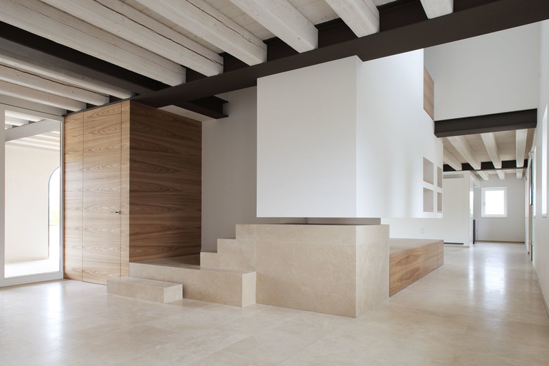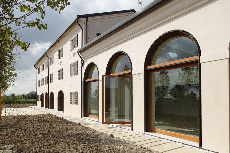 A wide rural building located in Treviso countryside, used mainly as a farmhouse, had to be restored and converted into a family house. The first step was to remove. To remove the annexes and all elements that had been added through the years to the original structure, such as the wall plugs used to close the arches and the interior divisions that hid the original dimensions. Inner spaces were re-organized following a new hierarchy based on the pre-existing spatial values of the building plan that had never been exploited due to the discontinuous and fragmented use of spaces and depots. The building, whose main part dates back to the first years of the 19th century, has been unveiled and interpreted through a sober and minimal architectural language. The original arch shape has been underlined by a painted iron frame; the same element has been chosen for the inner structural frame so that it combines perfectly with plaster and wooden surfaces. The colour chosen for the exterior plaster - almost similar to the colour of the existing clay ground - combines with the travertine that covers the ground floor flooring. The ground floor was projected to gain wide spaces that offer a clearer definition of the ambient. Everything is organized and neatly connected to a “spinal column” that crosses the hole house along the northern wall, so to make the movement from one space to another more intuitive and more controllable . Inner spaces expand towards the exterior through wide glass windows, easing the continuity of the interior subdivision sequence with the exterior flooring made of pigmented concrete slabs. The original fireplace called “alla vallesana” (typical of this region) was renewed even though just a few of the original elements had remained. Upstairs are the bedrooms. Especially in the attic, characterised by wide spaces, it was decided to avoid excessive subdivisions, in order to emphasize the peculiar spatial characteristics, strengthened by the presence of the massive wooden trusses. In the central part of the building, that originally hosted the stable, a new wide hall with a mezzanine was gained. The whole building is completely energetically self-sufficient thanks to a photovoltaic 70 Kw power plant. The high potency of the power plant is justified by the need to produce energy, heating and cooling for the building with the possibility to expand it to others parts that are not restored yet. The photovoltaic power plant is totally integrated within the roof and it extends also on a car parking shelter which has been partially sunk in the ground. The house has an innovative HAVC system with heating pump that guarantees high potency with low energetic consumptions if referenced to the building dimensions and its interior spaces. Every house consumption is of electric type and the entire energetic requirement is covered by the photovoltaic power plant so that the house can be considered as zero impact.