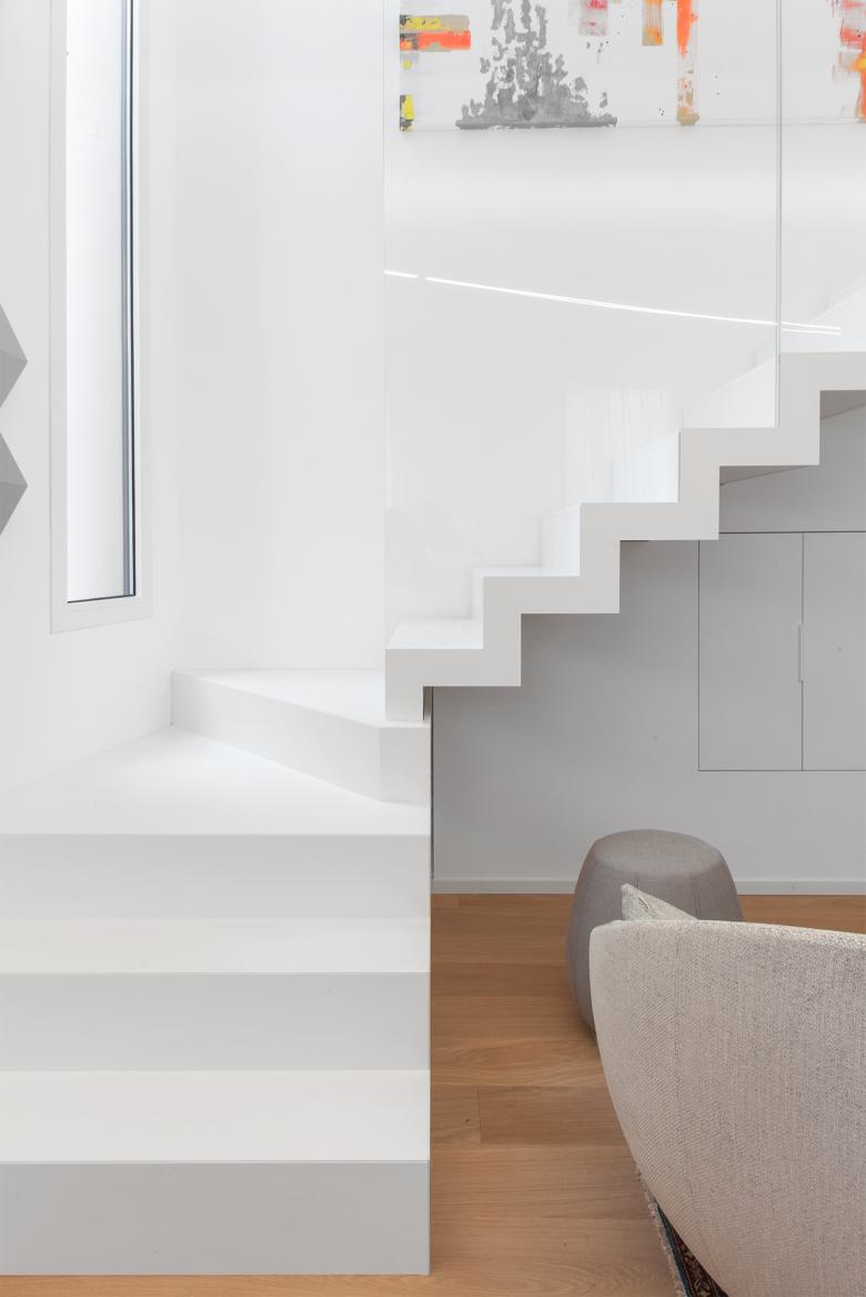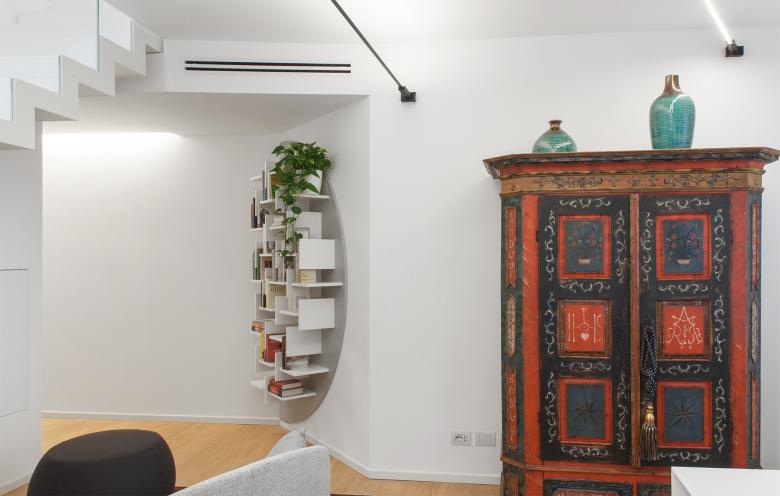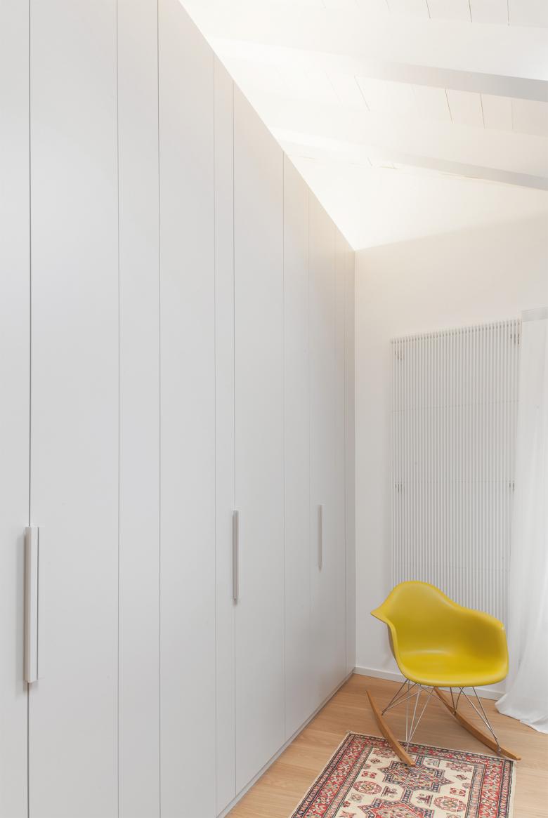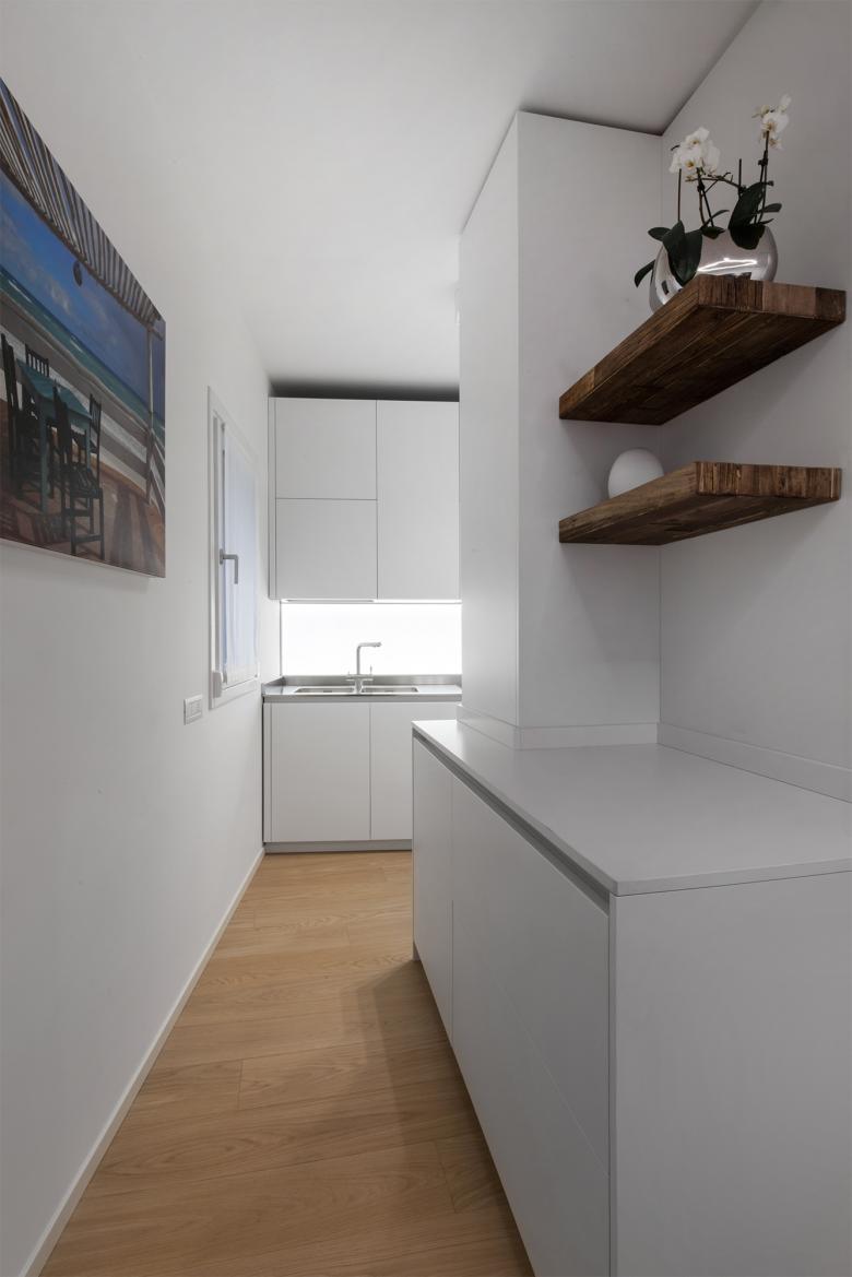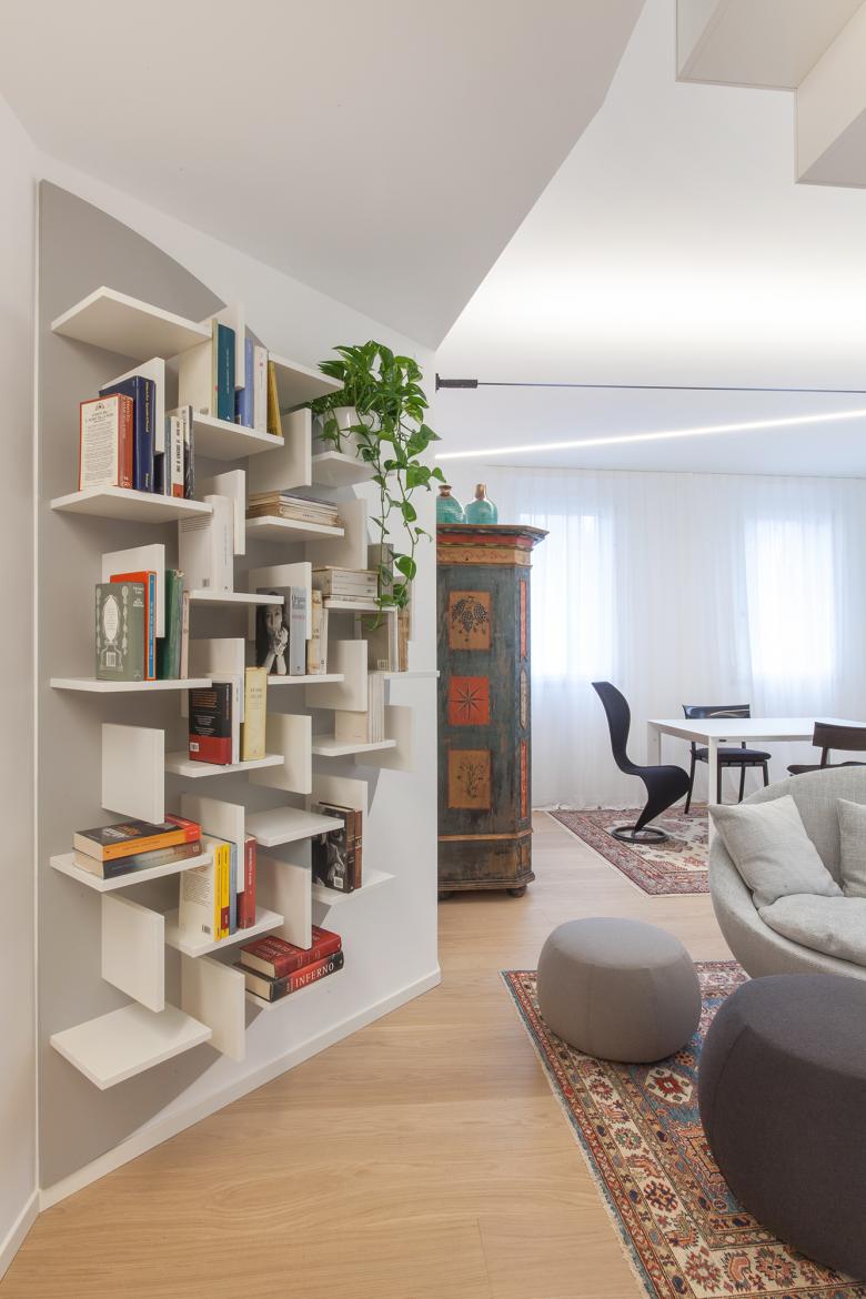 Attraverso piccole azioni, lo spazio irregolare e compresso, esito di un restauro che lo aveva fortemente conformato negli anni Novanta, è stato letto e reinterpretato come un percorso che si sussegue lungo tutti gli ambiti dell’appartamento – ingresso, cucina, soggiorno, camere – in modo che tutti gli spazi della casa diventino riconoscibili attraverso un unico gesto.
