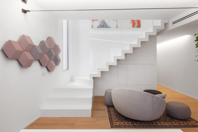 Il bianco è la componente dominante che avvolge lo spazio in questo progetto di ristrutturazione d’interni di un piccolo edificio nel cuore del centro storico di Oderzo.