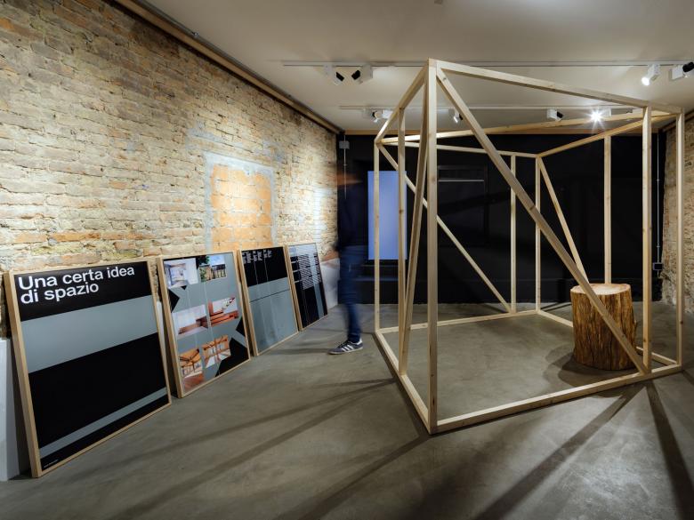 Una struttura lignea cubica di 222 cm per lato costruita con semplici morali di abete è l’elemento che misura lo spazio interno della galleria, una sorta di misuratore dello spazio che permette al visitatore una lettura lo spazio esistente individuando relazioni e scorci prospettici differenti. Un allestimento che diventa l’espressione costruita della pratica progettuale dello studio.