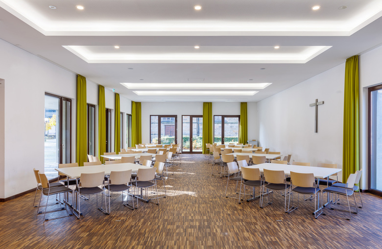 Das Pfarrheim stellt sich als ruhiger, homogen geformter Baukörper dar. Grundlage der Gebäudekonzeption ist eine klare und übersichtliche Grundrissdisposition. Das Foyer als Verbindung zwischen Gemeindeplatz und Gemeindesaal erschließt sämtliche Räume. Der große Gruppenraum im Erdgeschoss ist mit dem angrenzenden Saal zu einem weiträumigen Pfarrsaal zusammen schaltbar.