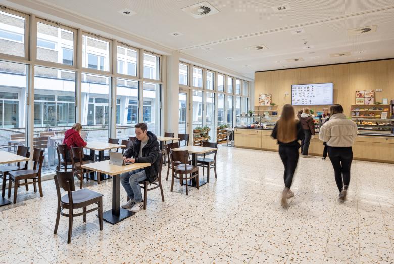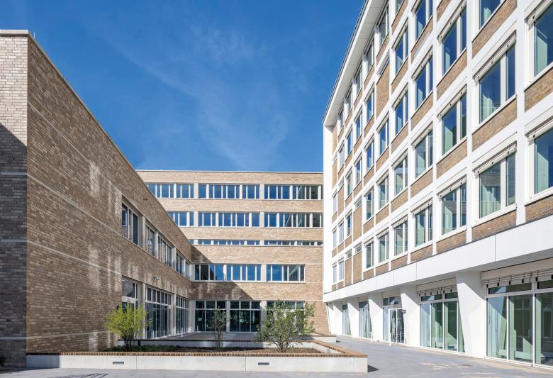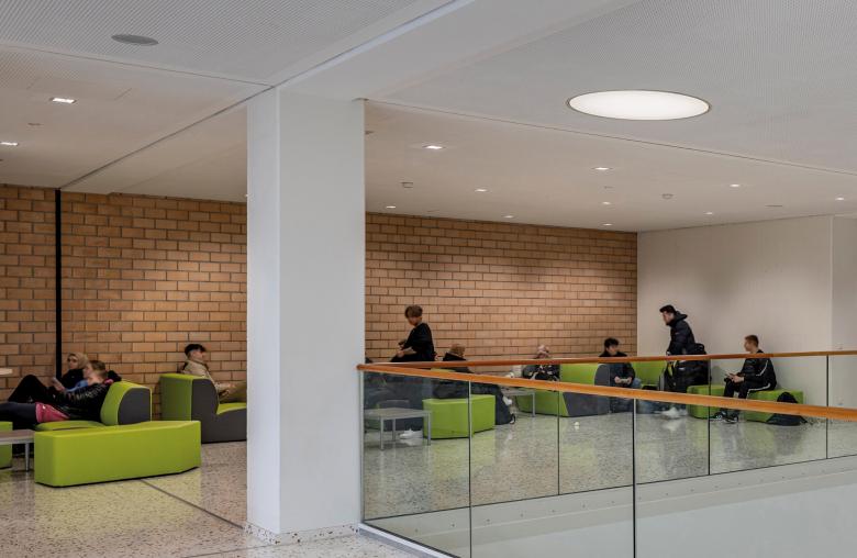 Die heutige Architektur bildet den baulichen Rahmen für die Umsetzung des pädagogischen Konzepts der Schule und offeriert vielfältige Nutzungsmöglichkeiten. Im Bestand wurden im gesamten Schulkomplex Lerninseln und Aufenthaltsbereiche geschaffen, die Raum für eigenverantwortliches Lernen, Gruppenarbeit, individuelle Förderung und Rückzug bieten. Forum, Bistro und Selbstlernzentrum werden multifunktional im Tagesverlauf von schulischen und außerschulischen Akteur*innen genutzt. Offene Lern- und Erschließungszonen, tageslichtversorgt durch große Fensteröffnungen, Lichthöfe und Oberlichter, sowie Transparenzen zwischen Räumen und Ebenen bilden Sichtbeziehungen. Das Material- und Farbkonzept schafft Identität und Orientierung und trägt wesentlich zur angenehmen Lern- und Lebensatmosphäre bei.