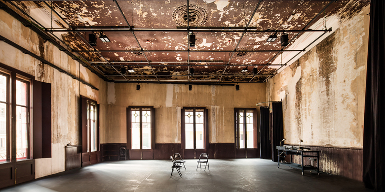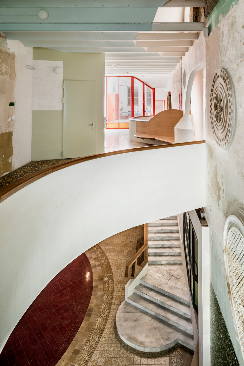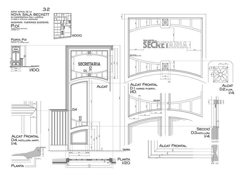 Visiting the abandoned building of the old Cooperativa Paz y Justicia for the competition of the new Sala Beckett was like entering a time tunnel, taking us back to the moment where it was used as a meeting place, small theatre, public house and a place for gatherings and parties. A large majority of the decoration was still preserved in its walls, roof and floors, which helped us to understand the different occupations that once took place; flooring in hydraulic mosaic, doors and carpentry in wood with coloured glass, frames and rosettes in the rooms... defined large spaces, unusual for Barcelona were it not for its location in a part of the city with an industrial past, where the majority of buildings are warehouses and factories. The dimension and structure of this cooperative were also that of an industrial warehouse, however it was the decoration which converted this space into one for festivities. Despite being abandoned, we found a building whose walls were still loaded with history and emotions that the project could therefore incorporate, recovering for the new Sala Beckett a building that was present in the collective social memory of this neighbourhood, thus maintaining its spirit, its vast collection of memories lodged in its spaces, so that it reintegrated naturally into its cultural dynamics and that the neighbours, many of whom had been members of the cooperative, could recognise themselves in it.