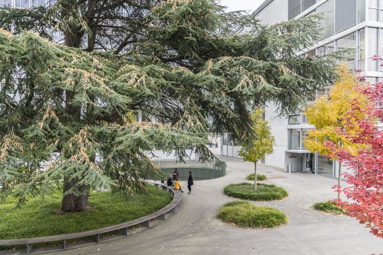 Wer den Swatch/Omega-Campus betritt, bewegt sich durch eine Baumhalle. Die Bewegung lässt die Säulen der Stämme oszillieren. Vordergrund und Hintergrund scheinen in verschiedenen Geschwindigkeiten vorbeizuziehen. Die Logik eines Rasters ist spürbar, doch nicht ganz greifbar, setzen sich doch einzelne Bäume aus dem alten Bestand über das Raster hinweg. Innerhalb des Rasters sind Wechsel der Atmosphäre, Verdichtungen, Aufweitungen, zu entdecken. Über die Baumkronen hinaus ragen weithin sichtbar die mächtigen Gebäude.