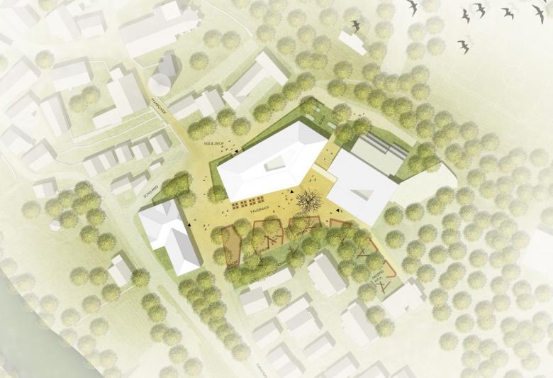 Der Entwurf für die Erweiterung der Primarstufe der Friedrich-Schelling-Schule in Besigheim formuliert einen selbstbewusst klaren und städtebaulich schlüssigen dreigeschossigen Baukörper mit polygonalem Grundriss. Der Neubau wird gekonnt auf dem zur Verfügung stehenden Gelände situiert und in die vorhandene topografische Situation eingebettet. Durch seine polygonale Gebäudeform nimmt der Neubau die Richtungen am Ort auf und verbindet sich auf gelungene Art und Weise mit den Bestandsgebäuden, so dass ein wirkungsvolles Gebäudeensemble mit gut proportionierten Außenräumen geschaffen wird. Resultat ist ein sehr schön gegliederter, großzügiger Pausenhof im Süden. Dieser bietet Raum für Spiel, Spaß und Kontemplation und sorgt so für eine ortsspezifische Identität mit hohen Aufenthaltsqualitäten für die Schülerinnen und Schüler. Der neu geschaffene Vorplatz im Norden ist funktional und schafft ausreichend Platz für den Kiss & Drop Bereich sowie für die Anlieferung, wenngleich die Lage des Kiss & Drop Bereiches im Preisgericht aufgrund der
