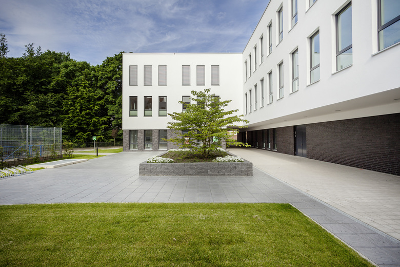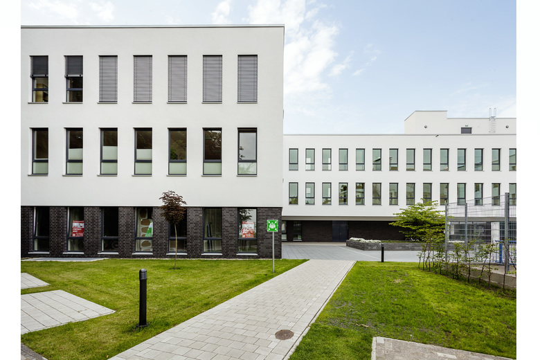 Die Fassade des Gebäudes ist durch großzügige stehende Fensterformate klar gegliedert. Das Erdgeschoss ist mit einer Fassade aus dunklem Verblendmauerwerk
