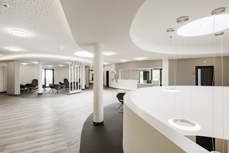 Das innenarchitektonische Konzept greift die wesentlichen Merkmale des architektonischen Konzeptes auf und trägt sie in die Ausgestaltung der Innenräume weiter. Zum einen wird die geschwungene Formsprache der Kubatur aufgenommen und zum anderen verstärken die Sichtverbindungen im Außen- und Innenraum den Ausdruck einer nicht stigmatisierenden Gesundheitseinrichtung. Im Hinblick auf die lange Verweildauer der Patienten, wurde sehr viel Wert auf den Innenausbau gelegt, der eine hohe Aufenthaltsqualität gewährleistet.