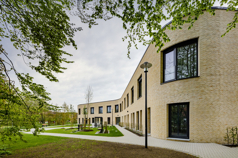 Der Neubau der Fachklinik nimmt die zentralen städtebaulichen Achsen der angrenzenden Gebäude auf dem Klinikgelände auf und folgt der geschwungenen Linie der Norderbäke. Dadurch erhält der Baukörper seine charakteristisch fließende Struktur und verschmilzt zu einem einzigartigen Gebäudekubus. Die bereits vorhandenen Gebäude auf dem Klinikgelände bestehen aus rotem Sichtmauerwerk. Der Neubau nimmt das vorhandene Material „Ziegel" auf, setzt sich aber durch seine helle Sandsteinfarbe von den vorhandenen Klinikgebäuden ab.