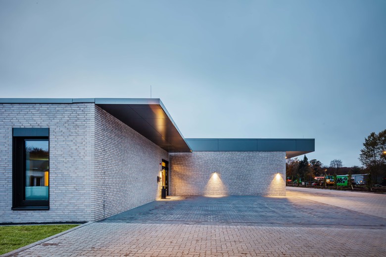 Die klare Gliederung und Ablesbarkeit der Nutzungen wird auf die Fassadengestaltung übertragen. Die Fahrzeughalle ist zudem mit einem großen Vordach als Schutz vor Regen oder Wärme ausgestattet. Die Aufenthalts- und Ruheräume sind mit einer gleichmäßigen Lochfassade versehen. Der Eingang wird durch ein weiteres Vordach betont.
