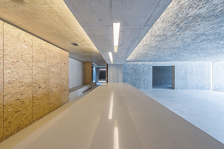 Mass and light, program free and Periphery – The stone H has a two-shell concrete structure. The outer shell of the H is casted with OSB, which generates a rough, almost organ surface. On the inside of the H the surface is smooth concrete.