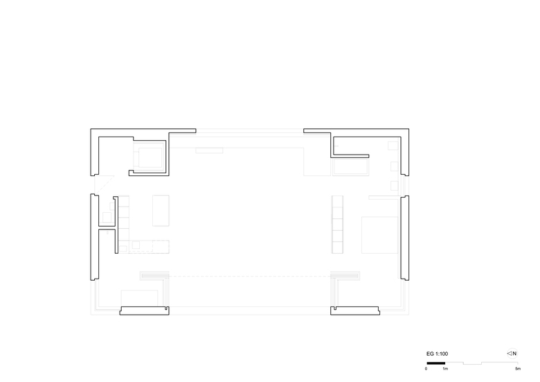 In our understanding of program free architecture, all programs are hidden in the periphery and can be deployed into the room as needed. The Leitmotiv of the mass is articulated by the sculpture of the H and even the interior walls, as they appear 0.5 m thick. These massive stone elements generate a strong force and attraction.