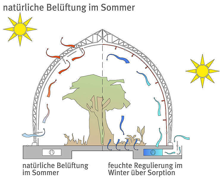 Die Stahlprofil- und Glaskondensation wird mit einer niedertemperierten Fassadenheizung fast auf Null reduziert. Die hohe Feuchtigkeit von den notwendigen 80 Prozent stellt eine Herausforderung an Material und Technik dar.