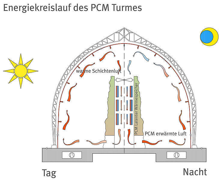 Zwei 17 Meter hohe Türme sind mit latenten Wärmespeichern ausgerüstet. Über Ventilatoren wird die warme Schichtenluft tagsüber wieder unten eingeblasen. Nachts wird die kühlere Raumluft über die tagsüber aufgewärmten latenten Wärmespeicher geführt und ohne Energiezufuhr erwärmt.