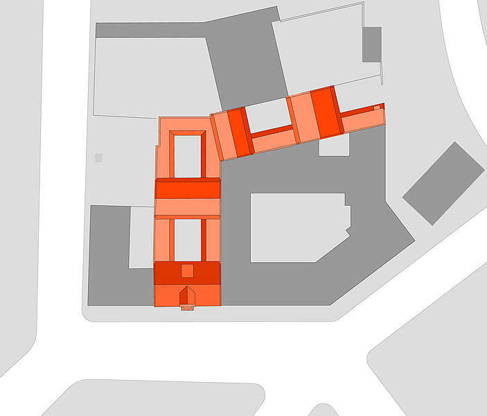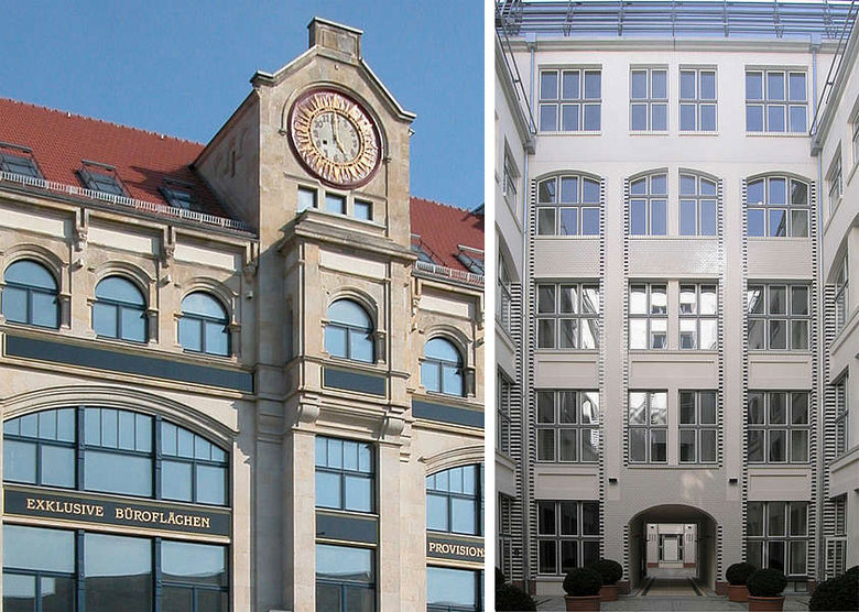 Das Bauensemble besteht aus einem Vorderhaus und drei Quergebäuden mit den dazugehörigen Seitenflügeln. Die 4- bzw. 5-geschossige Gebäudefiguration mit aufliegenden Dachgeschossen gruppiert sich um 4 Innenhöfe gleicher Größe; die Innenhöfe sind über Durchgänge verbunden. Diese Durchgänge, verbunden mit der vertikalen Erschließung (Treppenräume und Aufzugsanlagen), und die Hofflächen werden denkmalgerecht in der Materialwahl und Beleuchtung gestaltet.