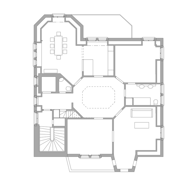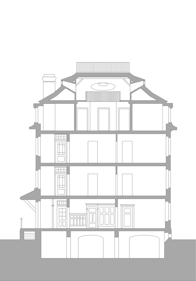 Im Mansardengeschoss wird eine überhohe Halle bis unter das Dach vorgesehen. Auf der Galerie befindet sich die Bibliothek. Über vier bestehende Dachlukarnen werden Galerie und Halle beleuchtet. Das vormalige Giebeldach wird bis auf die obere Binderebene abgeschnitten, so dass die oberste Wohnung eine Dachterrasse erhält.
