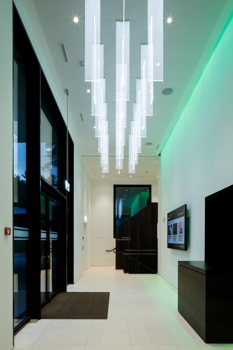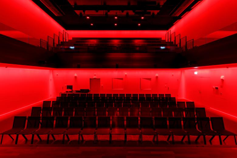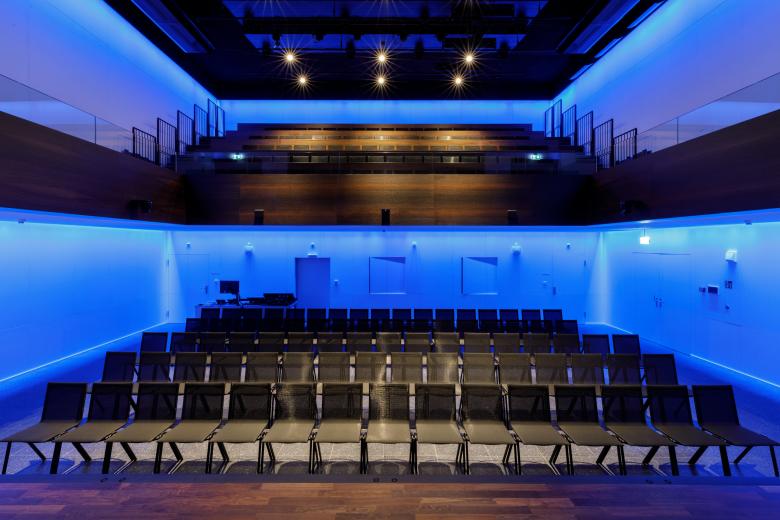 Der Veranstaltungssaal ist der Raum, in dem die Hauptaktivitäten stattfinden. Es handelt sich um einen zweistöckigen, geschlossenen Raum ohne Tageslicht-Öffnungen mit weißen Wänden, dunkler Decke und Holzfußboden. Ziel der Beleuchtung ist es, den Raum visuell zu erweitern und über die Bespielung der weissen Wände verschiedene Lichtstimmungen zu erzeugen. Die RGBW-Wandfluter sind umlaufend auf beiden Ebenen des Saals angeordnet. Der Lichtkegel dieser Lichtlinien ist sehr schmal, so dass das Licht nicht auf das Publikum fällt. Die Grundbeleuchtung erfolgt über Deckenfluter, die ebenfalls als RGBW-Farbwechsler für eine hohe Flexibilität in der Lichtstimmung sorgen. Die gesamte Innenbeleuchtung ist farbveränderlich (RGBW-Licht) und es gibt definierte Lichtszenen, die vom Nutzer ausgewählt und überschrieben werden können. Die Steuerung erfolgt über einen Touchscreen für die Alltagsnutzung oder ein umfangreiches Lichtmischpult, für die Lichtsteuerung bei Anlässen. Unter der Empore sorgen Einbaustrahler für die Grundbeleuchtung vor der Cateringzone.