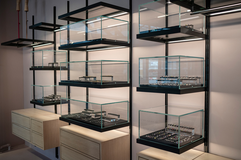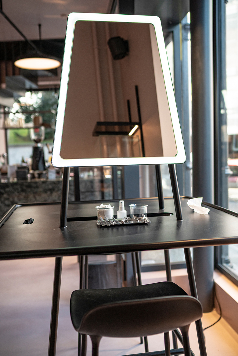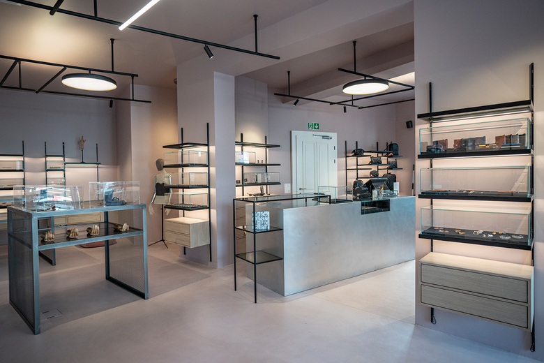 Neben vier Tattoo- und einem Piercingbehandlungsraum im 1.OG werden im Parterre Piercings, Schmuck, Accessoires und Pflegeprodukte auf filigranen unterleuchteten Regalsystemen präsentiert und mit eingelegten Vitrinen und Schubladenmöbel noch mehr betont. Der eigenentworfene Aluminium verkleidete Kassenkorpus und die Kaffeetheken Ablage aus massivem Verde Maritaca Granit setzen ganz klare Statements.
